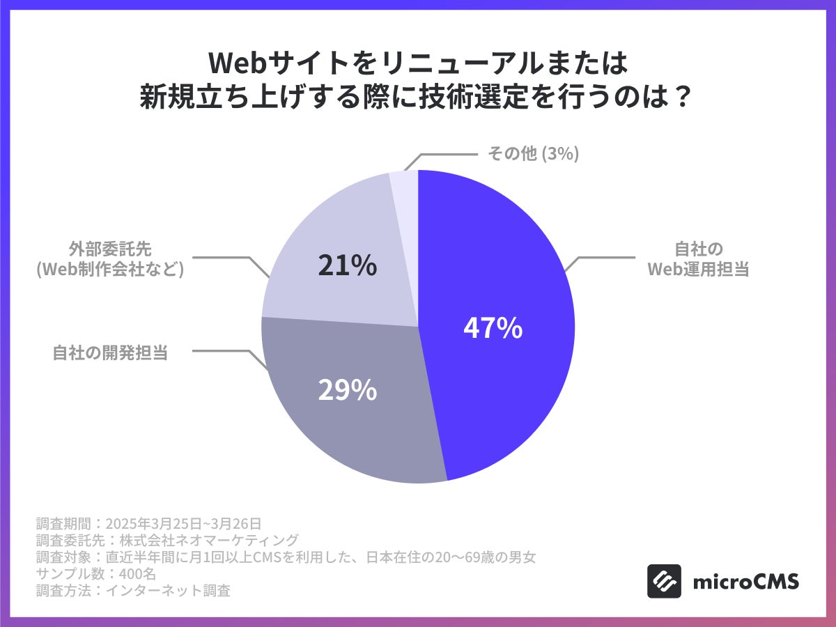 最も割合として高かったのは「自社のWeb運用担当」の47%という結果になりました。新規立ち上げやリニューアルの実装は主に開発担当者が担当する一方、技術選定は開発担当以外の部門が担う傾向が見受けられました。また、全体の約8割弱の企業が自社内で技術選定を行っている一方で、最終的には約4割の企業は外部にWebサイト構築を委託しているため、一定数の企業は制作会社などと協働して意思決定を行っている傾向が見受けられました。