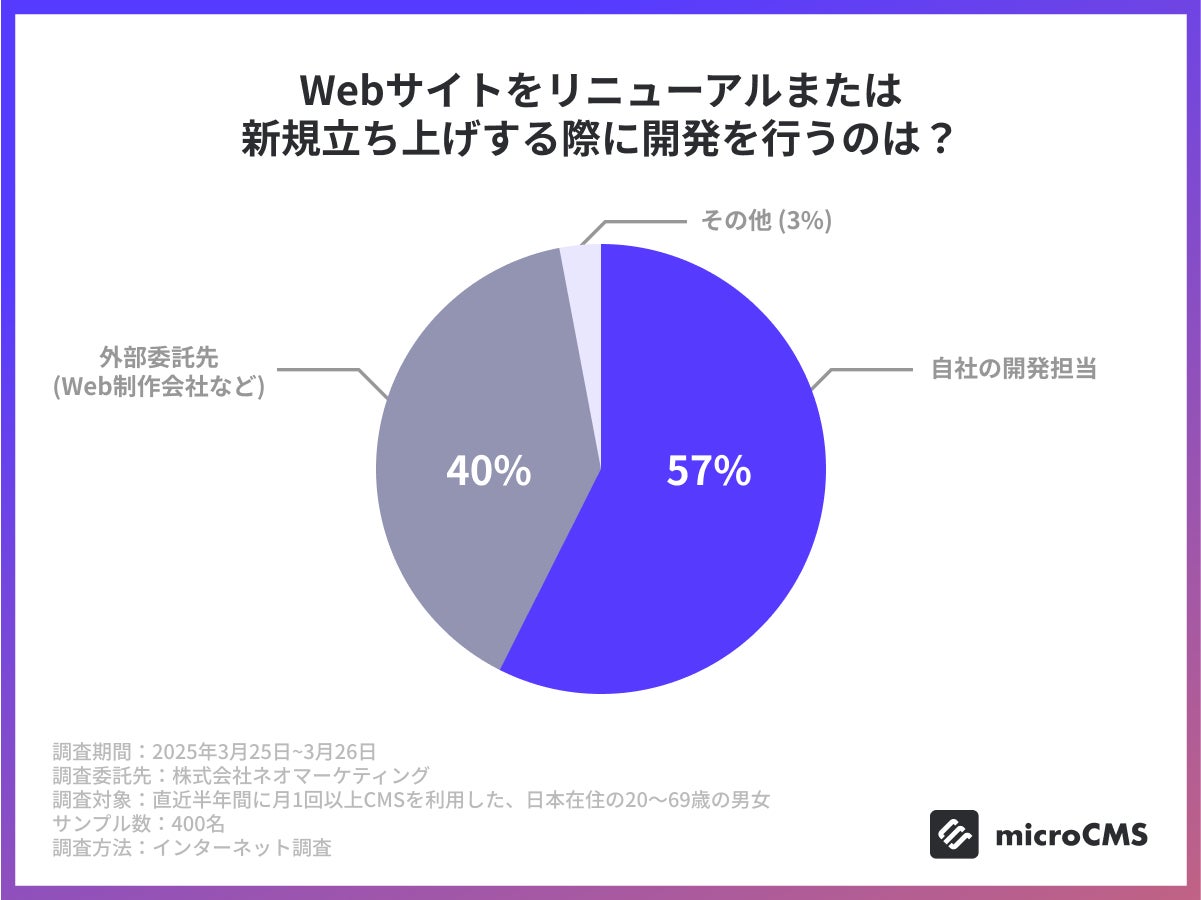 Webサイトの立ち上げ・リニューアルの開発は自社対応が約6割に対し、外部委託は約4割