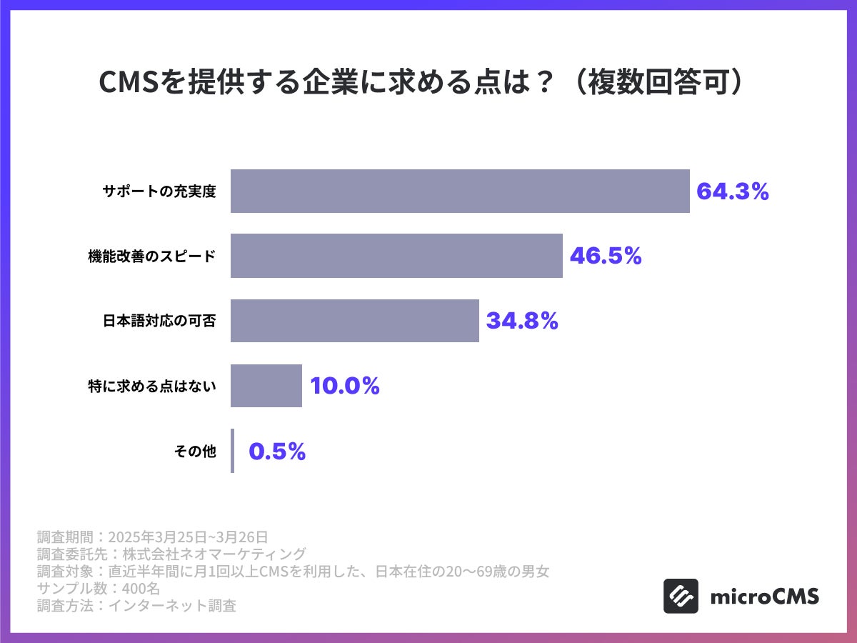 CMSを提供する企業に求めるのは「サポートの充実度」が最多、次いで「機能改善のスピード」