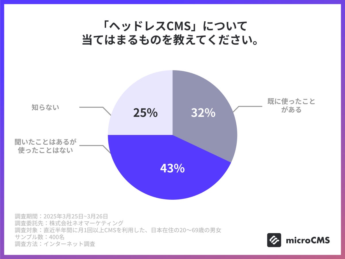 CMS利用者の「ヘッドレスCMS」の認知度は75%。一方で約4割は「聞いたことがあるが使ったことはない」と回答