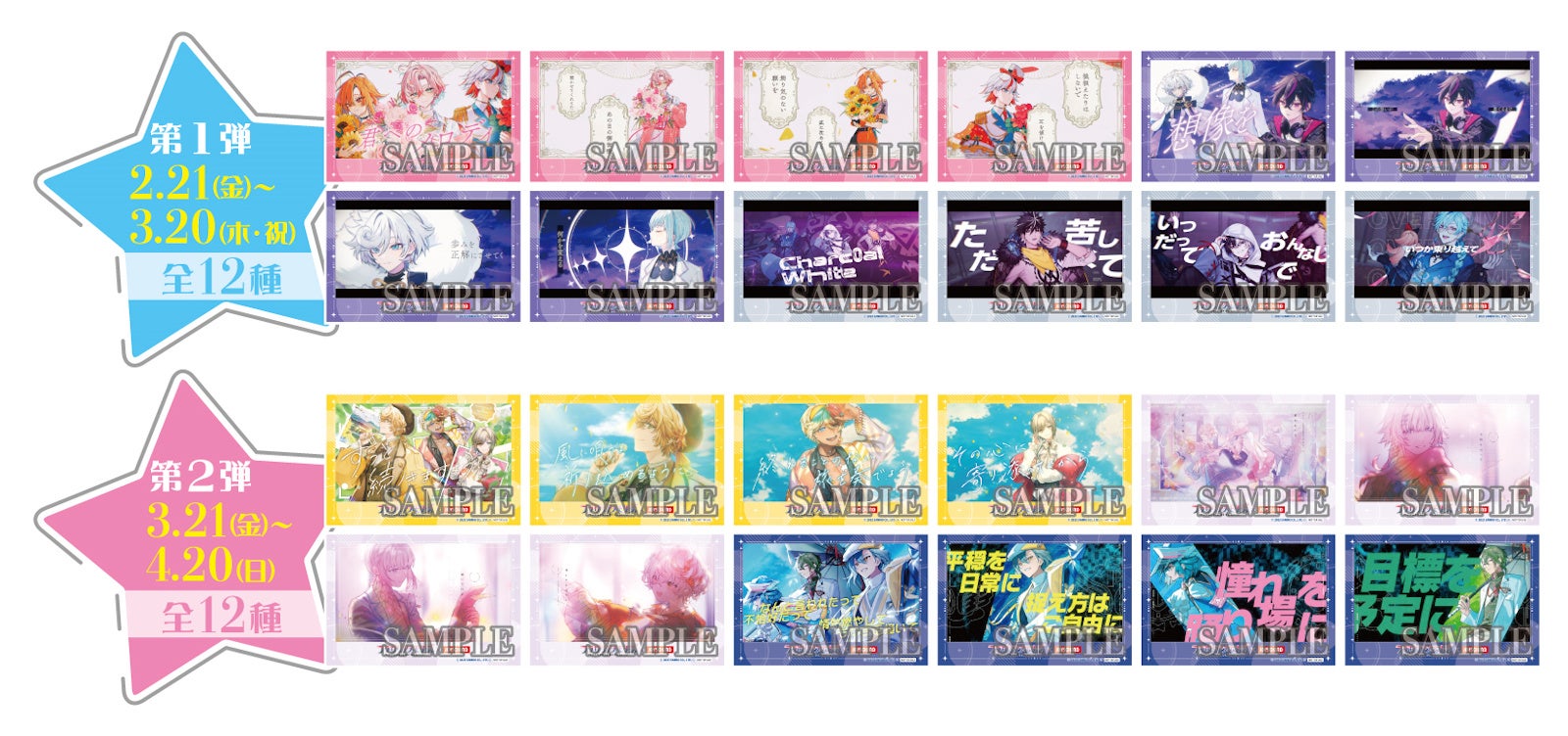コラボドリンク1品ご注文につき、オリジナルポストカードを全24種【第1弾:12種/第2弾:12種】の中からランダムで1枚プレゼント!