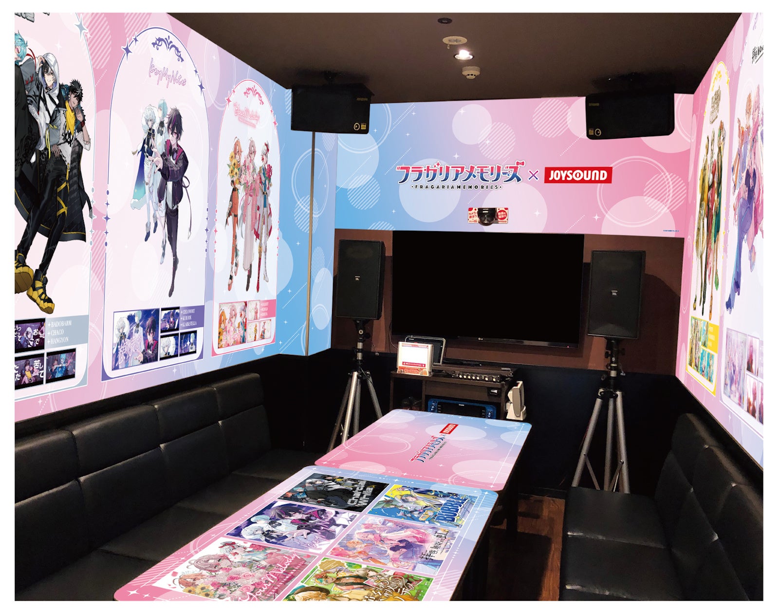 JOYSOUND池袋西口公園前店(東京)に展開するカラオケコラボルームは、ルーム内の壁面やテーブル、ドアに至るまで、「フラガリアメモリーズ」の世界観で彩られ、ファンには堪らない空間となっております。