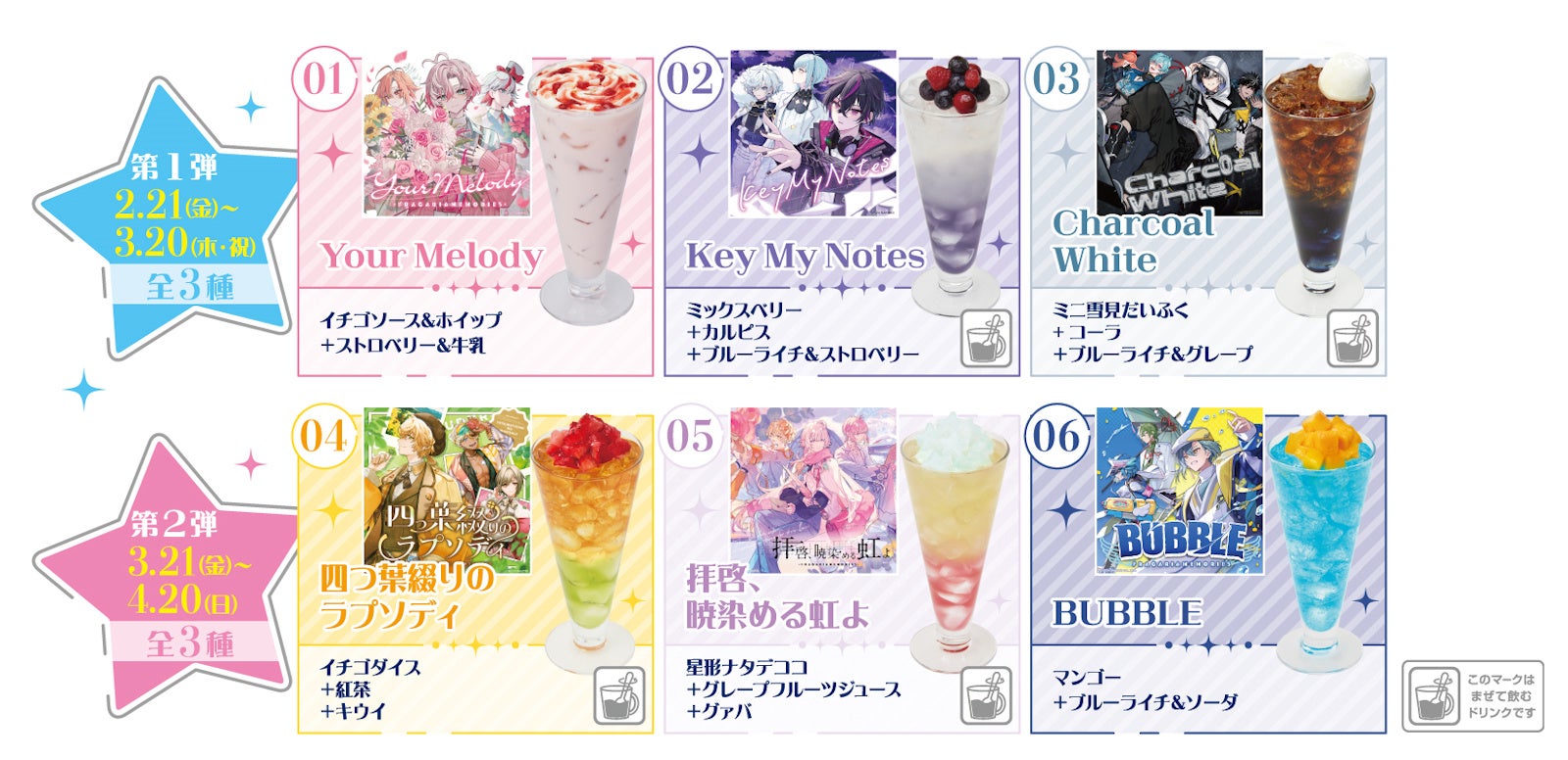 コラボドリンクには、「フラガリアメモリーズ」の楽曲をイメージした全6種【第1弾:3種/第2弾:3種】をご用意します。