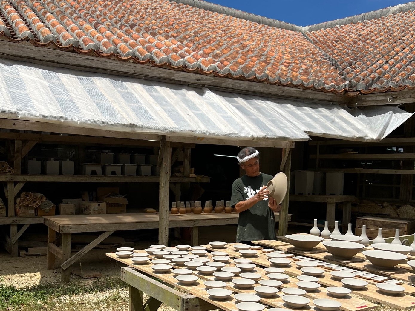 沖縄のやちむんを代表する北窯の陶工松田氏。今回、初窯出しの作品や大皿などを出展。
