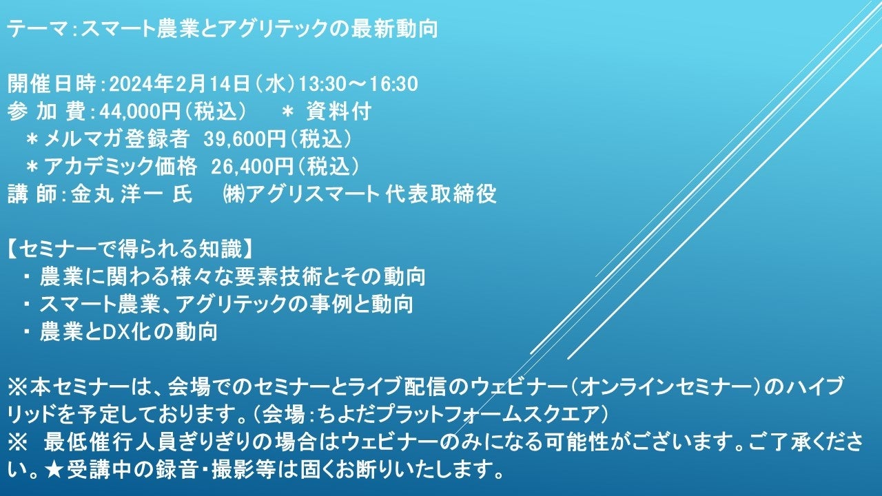 【会場/ライブ配信ハイブリッドセミナー】スマート農業とアグリテックの最新動向 2月14日(水)開催 主催:(株)シーエムシー・リサーチ