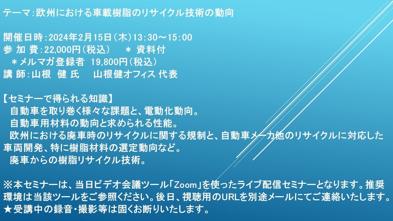 【ライブ配信セミナー】欧州における車載樹脂のリサイクル技術の動向 2月15日(木)開催 主催:(株)シーエムシー・リサーチ
