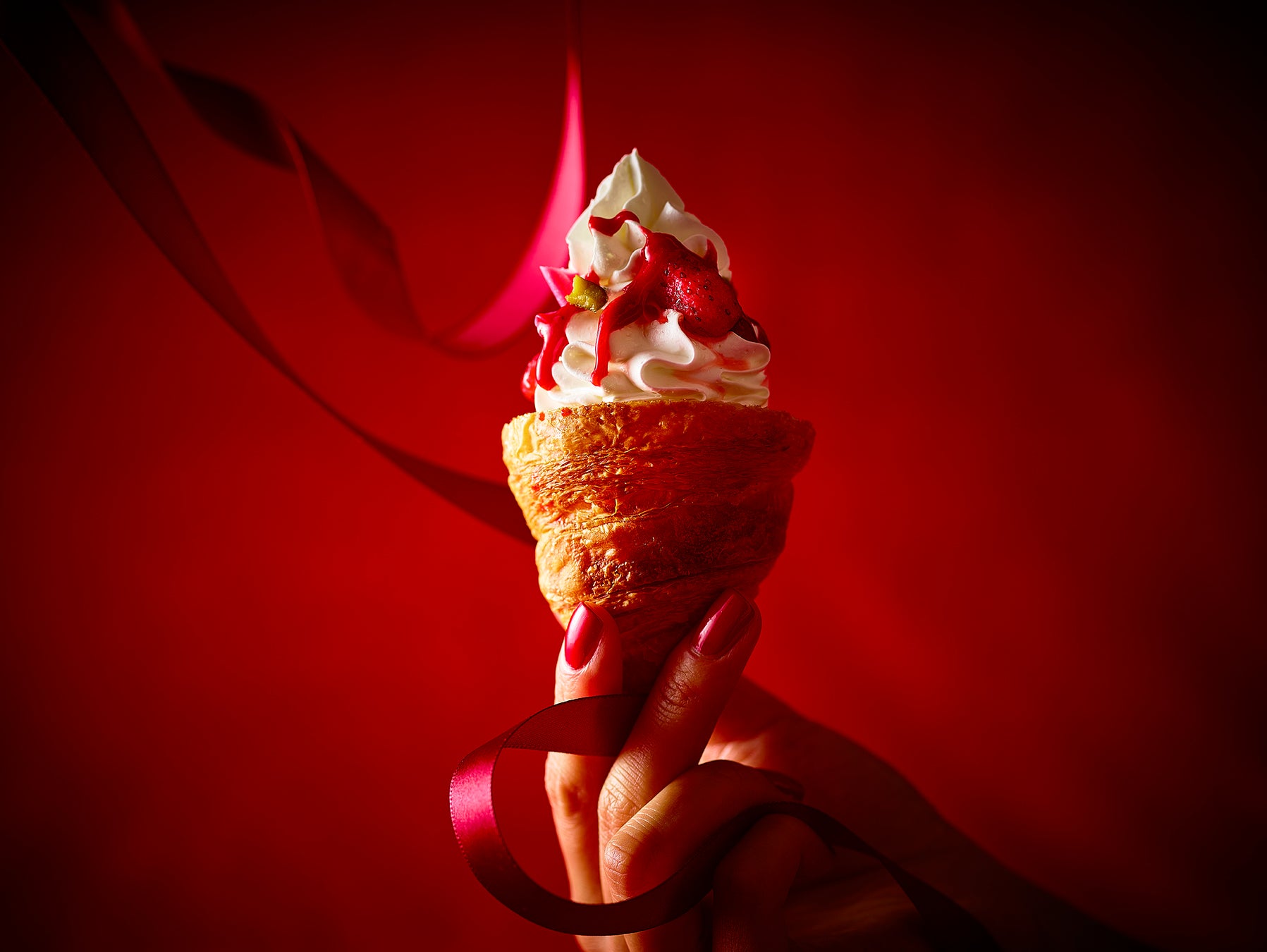 違う種類のスイーツを掛け合わせて作られた「ハイブリッドスイーツ」は新登場。「クロワッサン」と「ソフトクリーム」を掛け合わせた『いちごのクロ&ソフ』は、クロワッサンをコーンに見立て、その上にソフトクリームを絞りました。優しい甘さのソフトクリームと甘酸っぱいベリーソースを、クロワッサンコーンと一緒にいただく新感覚のスイーツは必食です。
