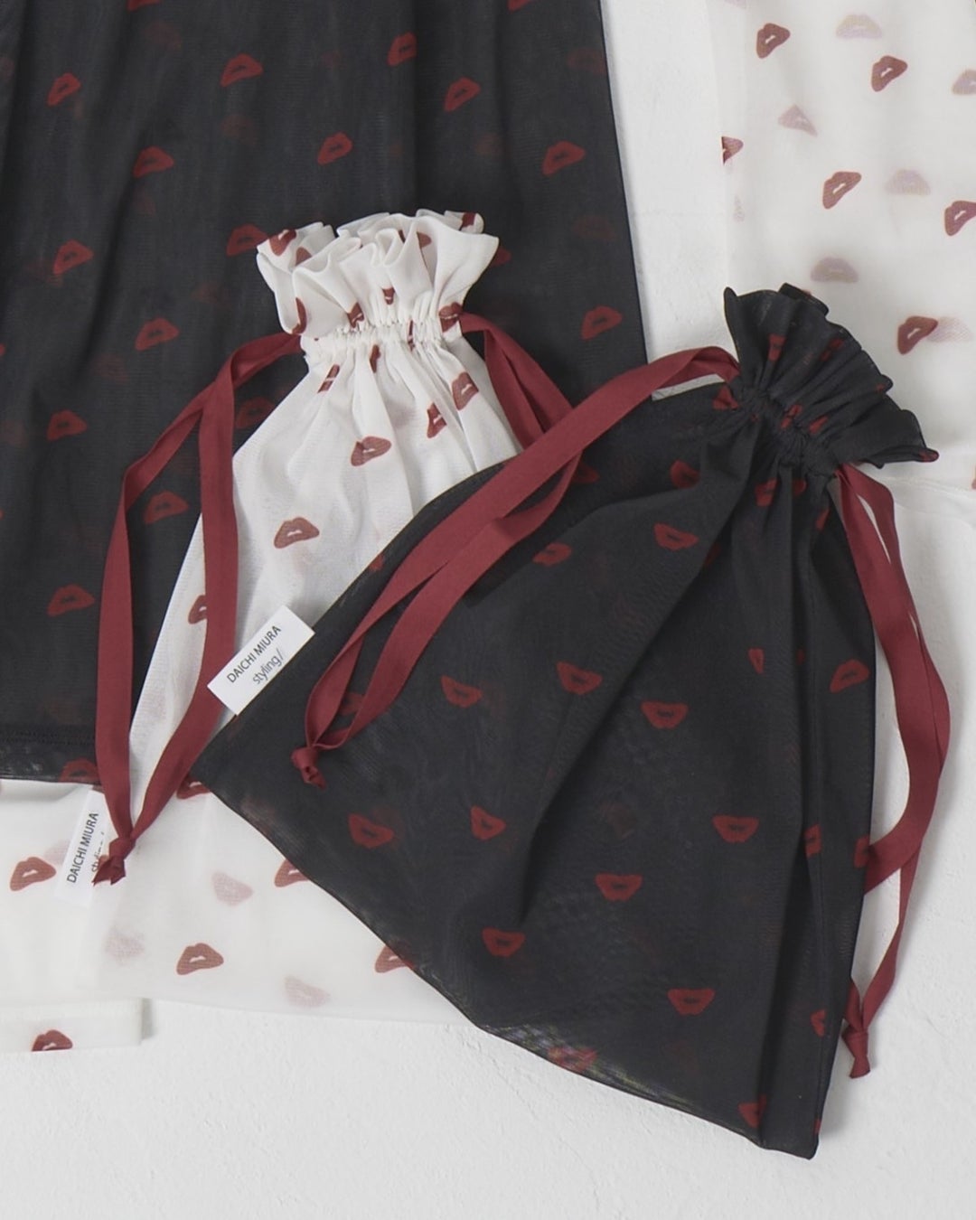 さらに本コラボレーションアイテムを含んだ税込み¥20,000以上お買い上げのお客さまにリップチュール巾着をプレゼントいたします。リップチュール巾着のブラックは阪急うめだ店限定カラーです。