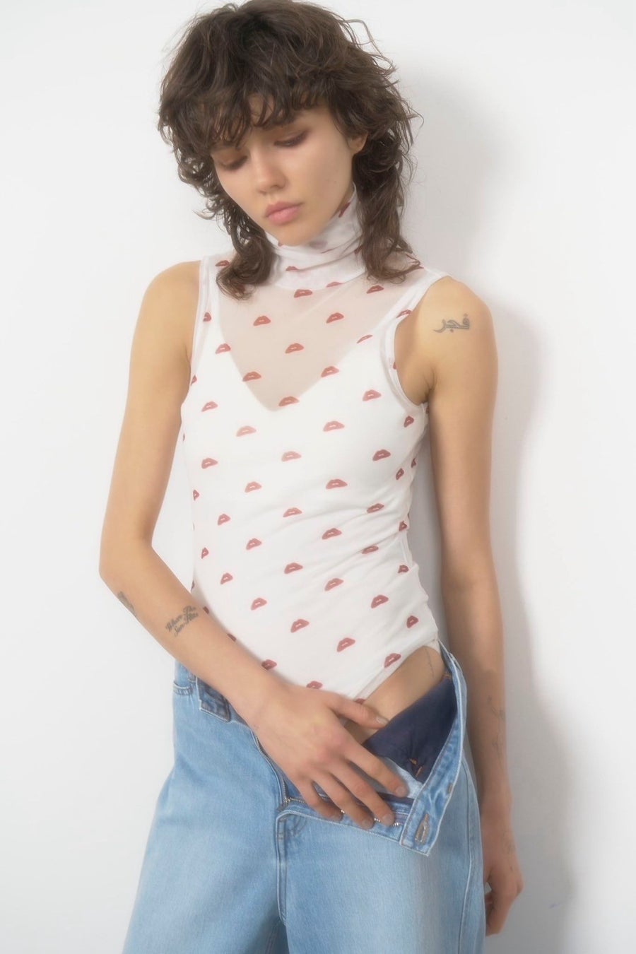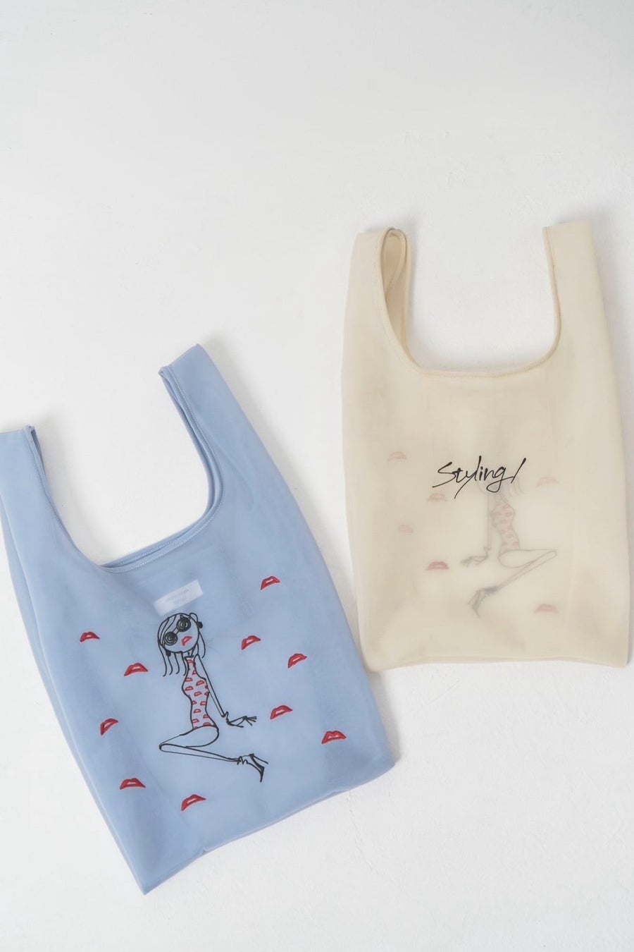 リップチュールボディスーツをまとったJosieを刺繍したシアーバック。