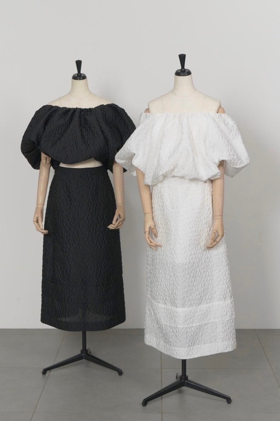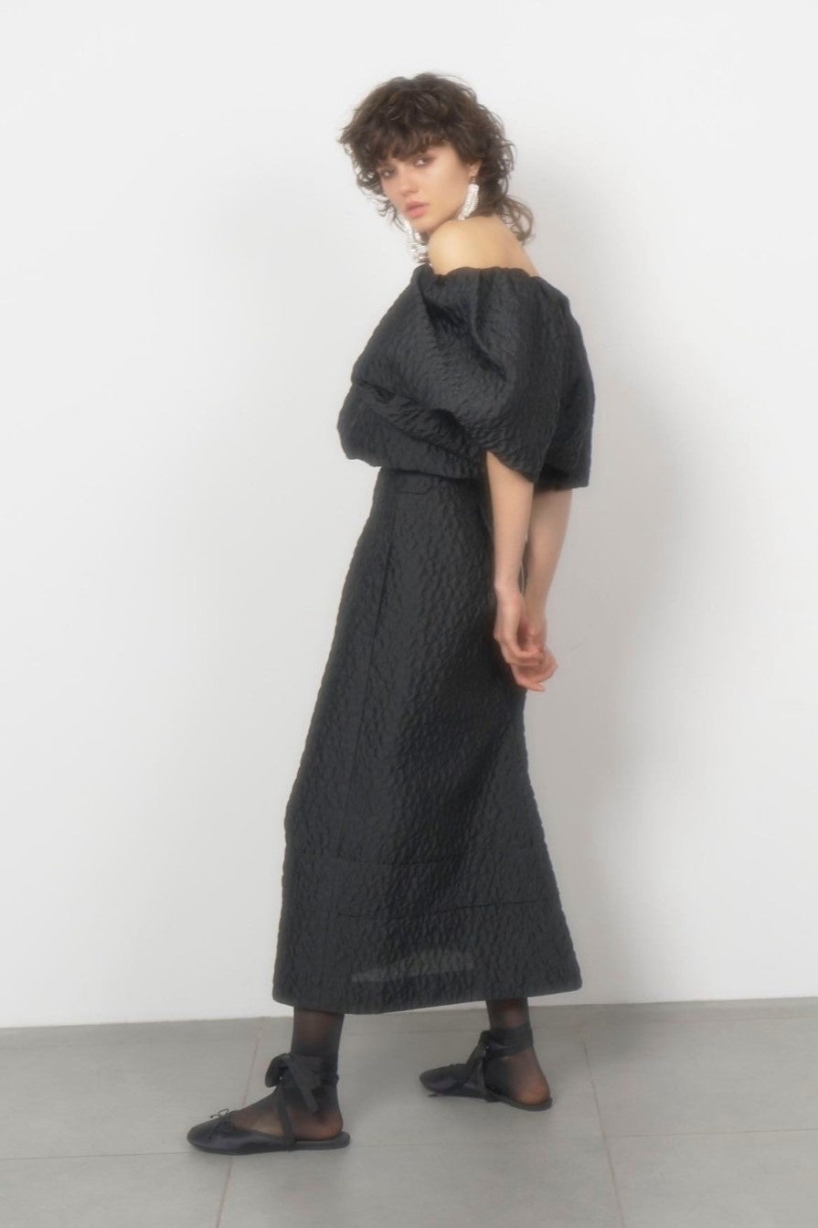 Josieのために特別にデザインされたこのセットアップは、ハート柄をモチーフにしたシアージャガードを贅沢に使用ました。球体のようなバルーンシルエットにこだわったトップスと、シャープながら構築的なデザインに仕上げたスカートはセットアップはもちろん単品使いでも目を惹きます。