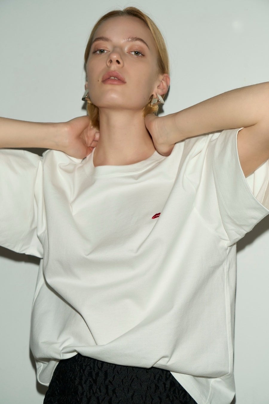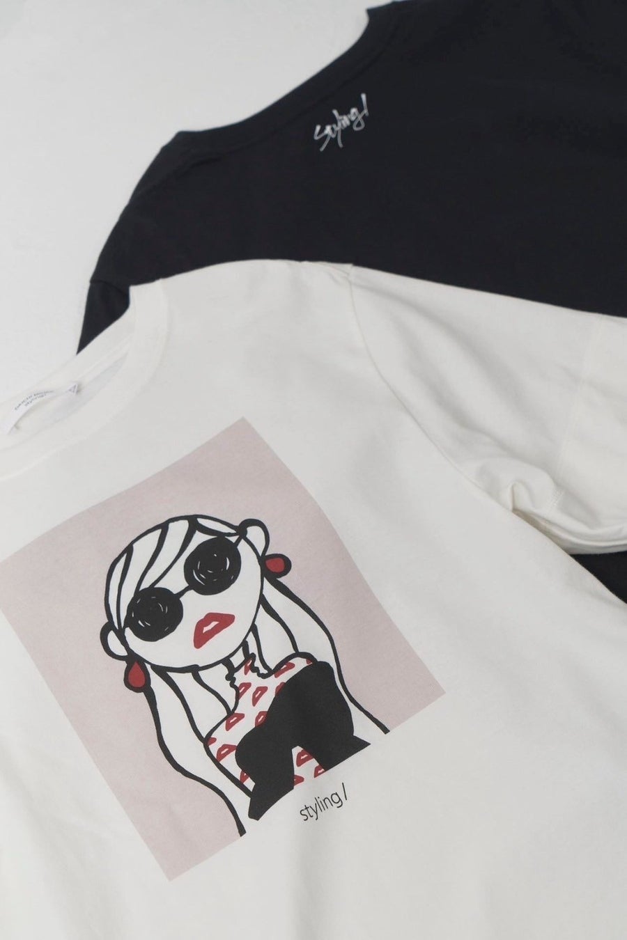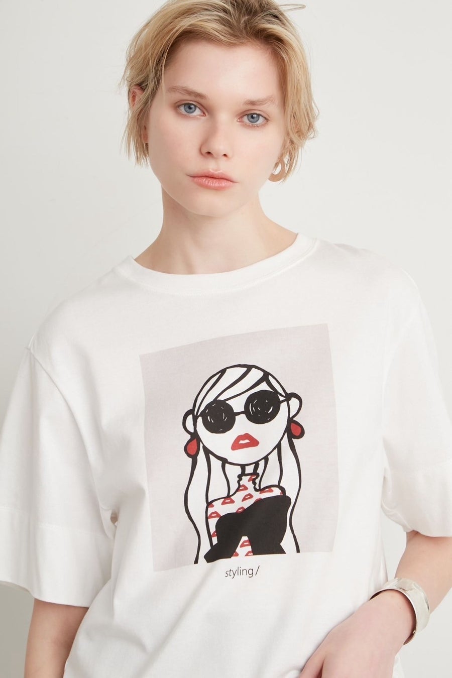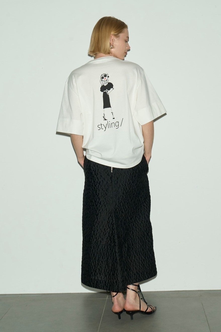 styling/をまとったJosieが描かれたTシャツは、ワイドスリーブデザインがポイント。