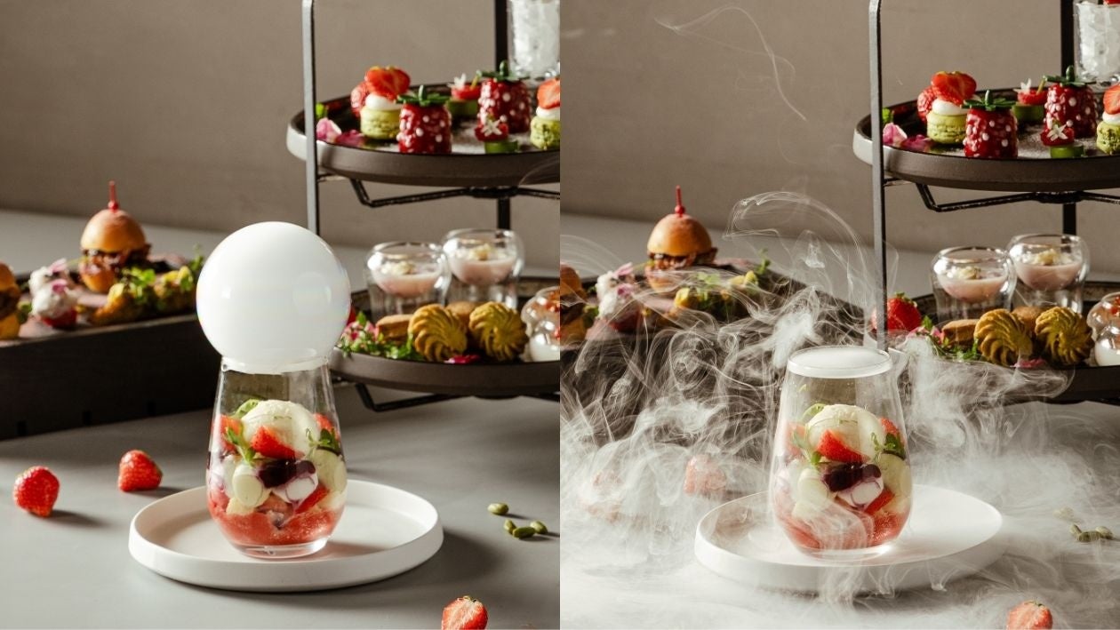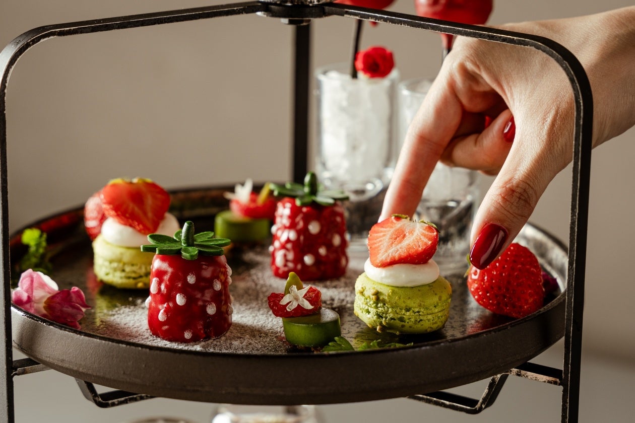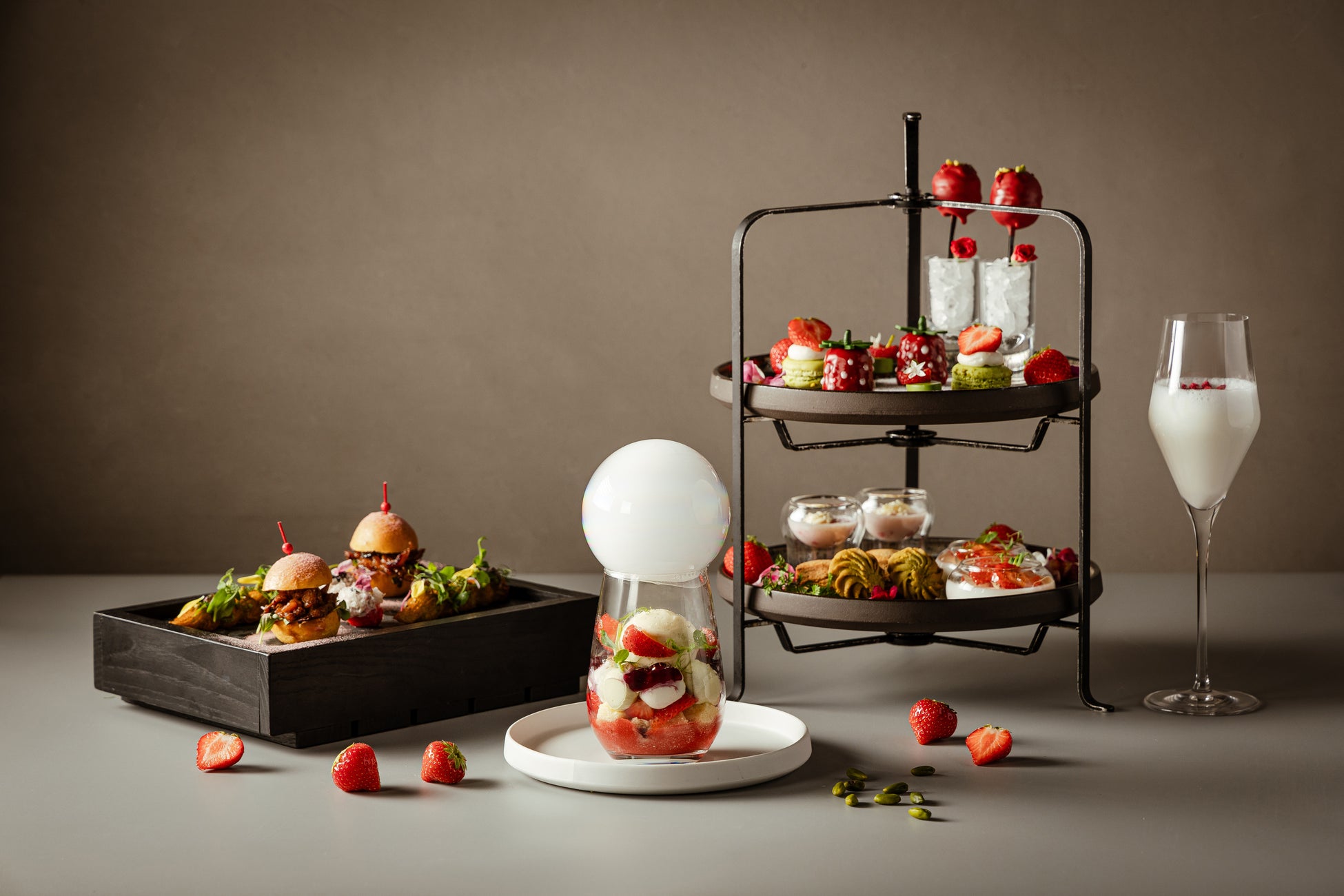今冬限定のアフタヌーンティーの主役は、ストロベリーとピスタチオ。鮮やかな赤とピスタチオグリーンを基調としたスイーツとセイボリーが、冬の訪れを華やかに彩ります。特にこだわりのスペシャリテ「Strawberry Bubble Parfait」では、泡が立ち上がり、瞬時に広がるストロベリーの香りが五感を刺激し、まさに感性を揺さぶる新感覚スイーツです。ピスタチオマカロンや、ストロベリーを模したカヌレなど、こだわりのスイーツに加え、ストロベリーマヨネーズを使用した照り焼きセセリチキンバーガーや、ピスタチオ&グリーンピースのスパイシーチュロスなど、ユニークな味わいをお楽しみいただけます。