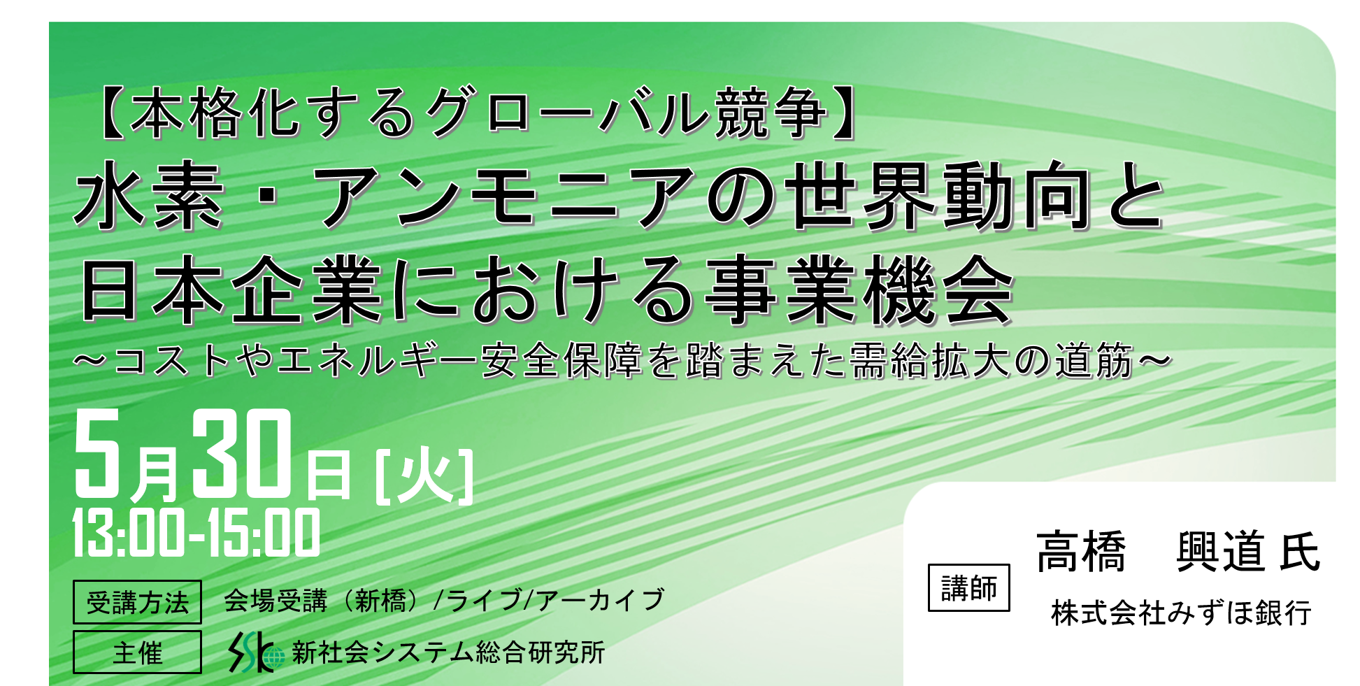 「水素・アンモニアの世界動向と事業機会」と題して、株式会社みずほ銀行 産業調査部 資源・エネルギーチーム 調査役 高橋 興道氏によるセミナーを2023年5月30日(火)に開催!!
