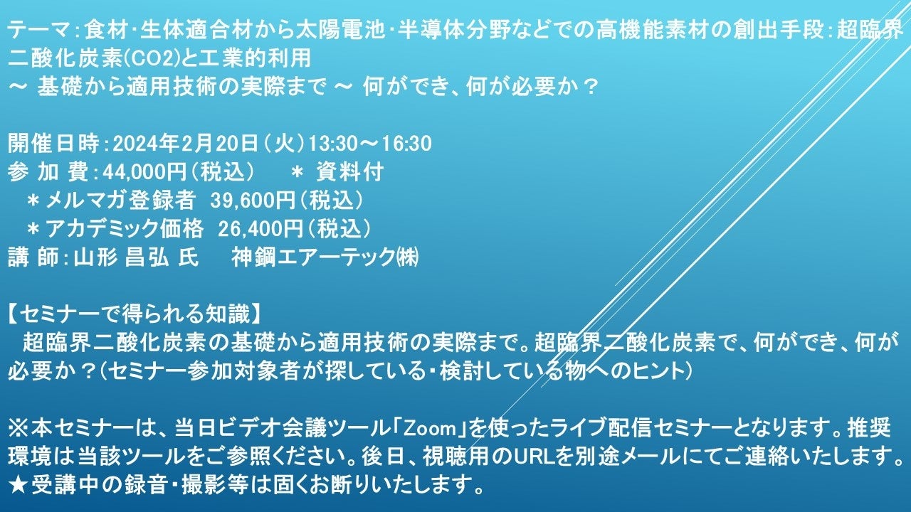 【ライブ配信セミナー】食材・生体適合材から太陽電池・半導体分野などでの高機能素材の創出手段:超臨界二酸化炭素(CO2)と工業的利用 2月20日(火)開催 主催:(株)シーエムシー・リサーチ