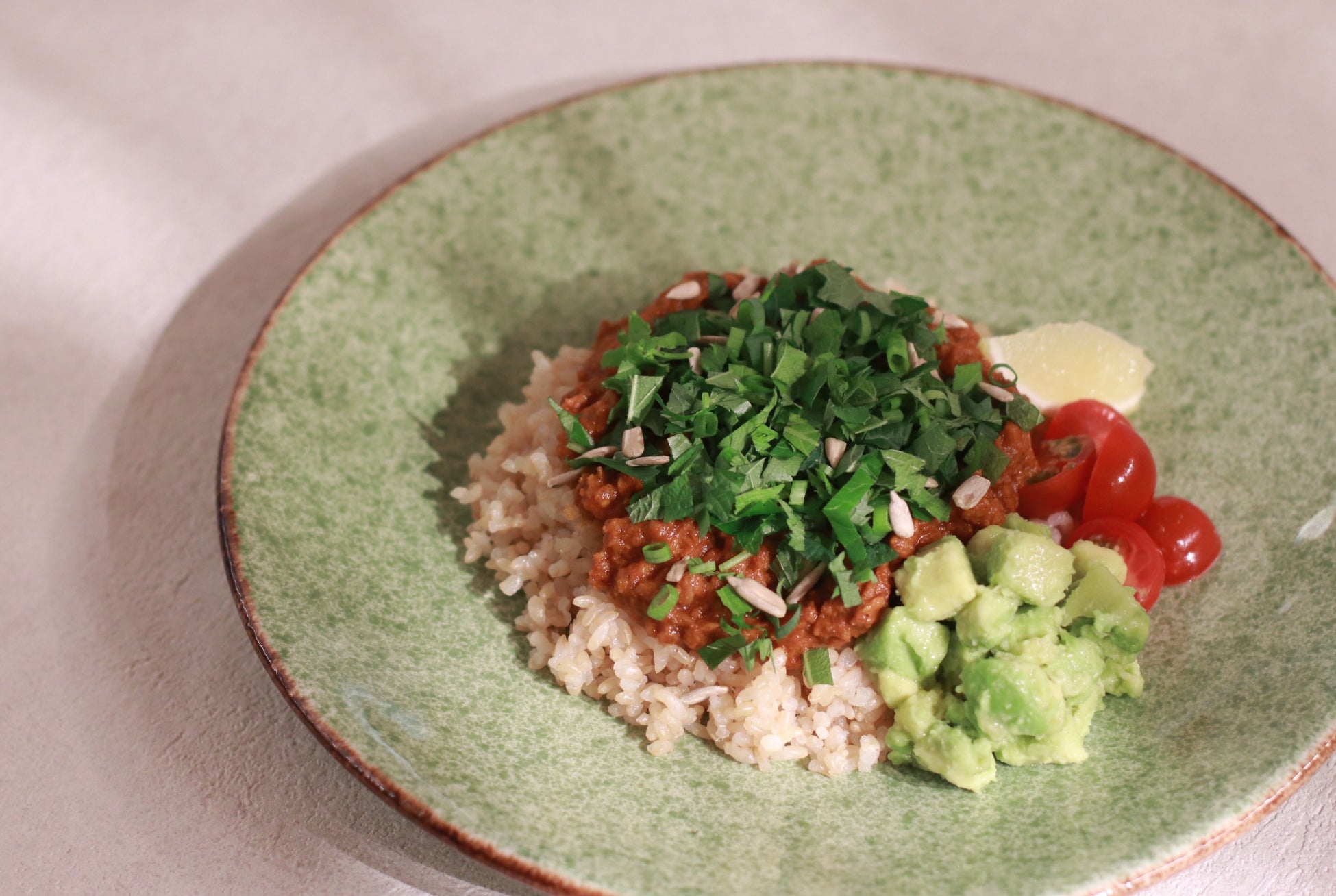 ミンチ状の大豆ミートを使用した、高たんぱくでヘルシーなヴィーガンカレー。旨辛の大人な味わいに深みと甘さを加えるのは完熟トマト。体に優しくしっかりと「スパイス欲」が満たされる、人気の一皿です。