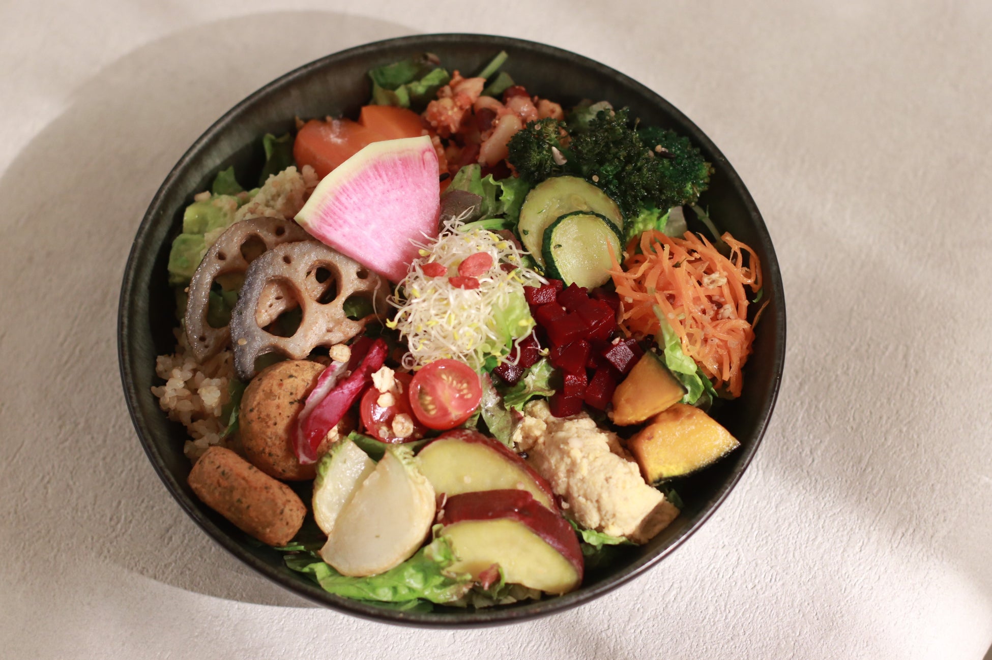 まろやかな酸味と芳醇な香りが豊かな有機バルサミコ酢の南蛮だれを絡めた大豆ミートのからあげと、たっぷりの野菜を楽しむ「からあげ丼」です。豆乳をベースに自慢のレシピで作る、卵不使用のさっぱりヴィーガンタルタルソースも魅力で、丼全体の味わいをバランスよくまとめ上げます。まるでお肉の唐揚を食べたかのような満足感を、味わっていただける一品です。