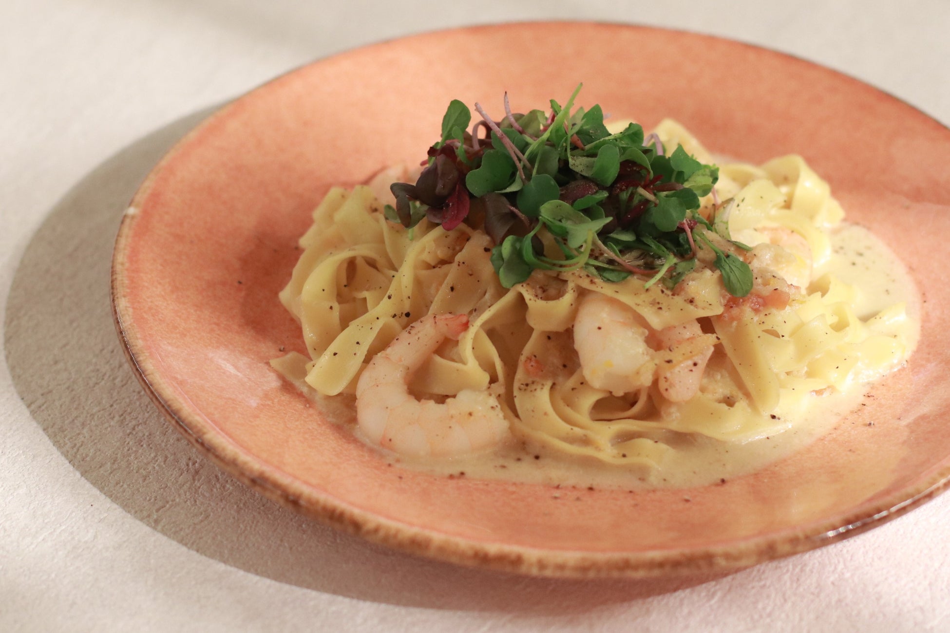 松乃井酒造の酒粕を使用した海老と柚子の豆乳クリームパスタ
