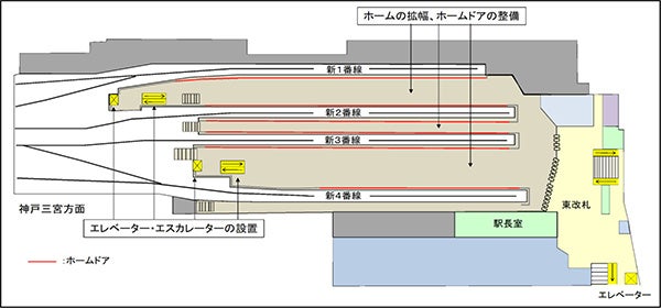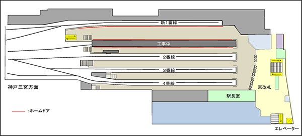 また、新2番線の供用開始に併せて、ホームからの転落事故等の防止策として、国、大阪府及び大阪市の補助を得て整備している新2番線ホームのホームドアも供用を開始します。なお、現在の2番線は、既存躯体の改築やホームドアの整備などを行うため一時的に閉鎖いたします。
