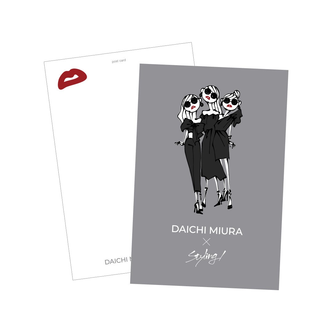 会期中、DAICHI MIURA × styling/ コラボレーションアイテムをお買い上げのお客さまにオリジナルポストカードを、さらに本コラボレーションアイテムを含んだ税込み¥20,000以上お買い上げのお客さまにリップチュール巾着をプレゼントいたします。リップチュール巾着のブラックは阪急うめだ店限定カラーです。