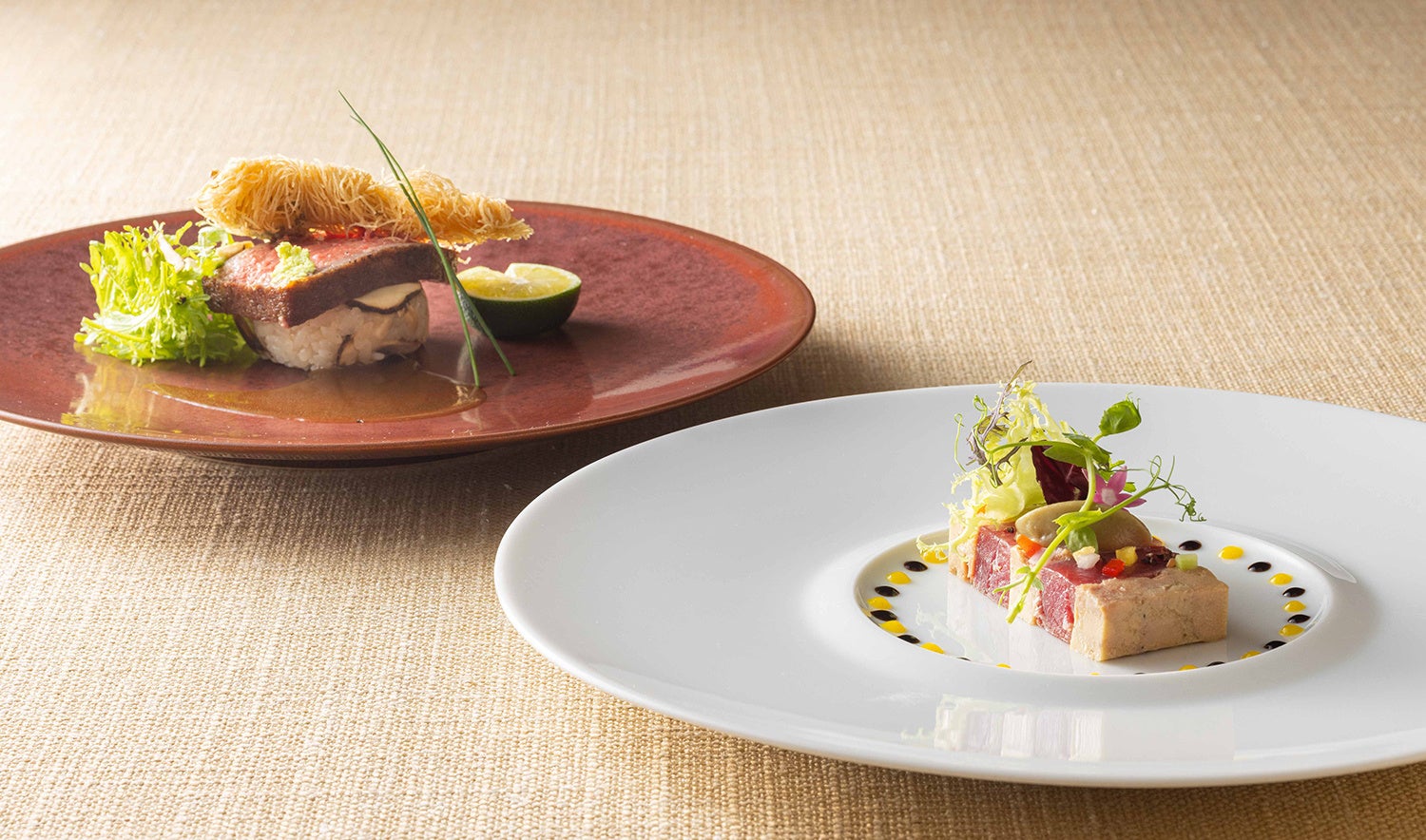 前菜で登場する「気仙沼港 昭福丸より届いた天然本マグロとフォアグラのテリーヌ 焼き茄子のフォンダン」(写真右)は、上質な脂と引き締まった身が特長の天然本マグロと、濃厚な味わいのフォアグラをあわせた贅沢な一皿。なめらかなフォンダンに仕上げた焼き茄子とご一緒に、その深い旨味をお楽しみください。また、「仙台牛ロース肉のロースト 松茸のフリットと松茸ご飯を添えて」(写真左)は、口当たりが良く柔らかな仙台牛を、松茸の香りとともにご堪能いただける逸品です。ほかにも、気仙沼産のフカヒレが入ったスープや、蝦夷アワビとジャンボ椎茸がコラボレーションした魚料理など、「クイーン・アリス」ならではの秋のスペシャリテを、この機会にぜひご堪能ください。