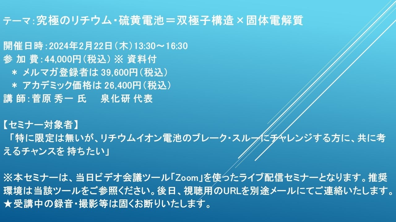 【ライブ配信セミナー】究極のリチウム・硫黄電池=双極子構造×固体電解質 2月22日(木)開催 主催:(株)シーエムシー・リサーチ