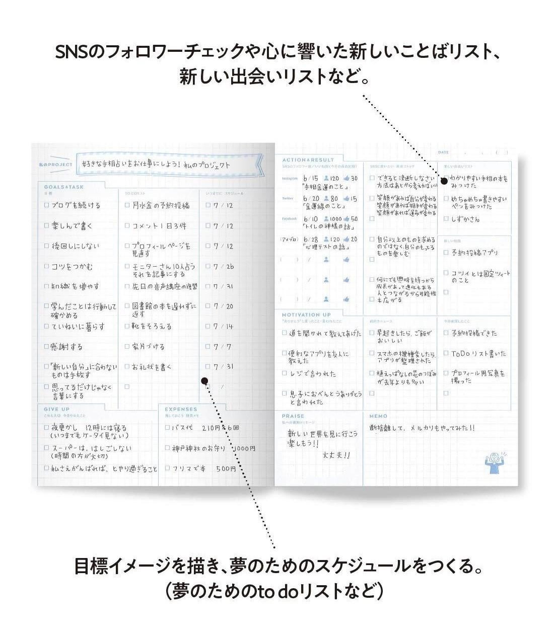 SNSのフォロワーチェックや、心に響いた新しいことばや出会いをリストにして記入できるノートです。目標イメージを描き、夢のためのスケジュール(to doリスト)などをつくることで、モチベーションをキープできます。