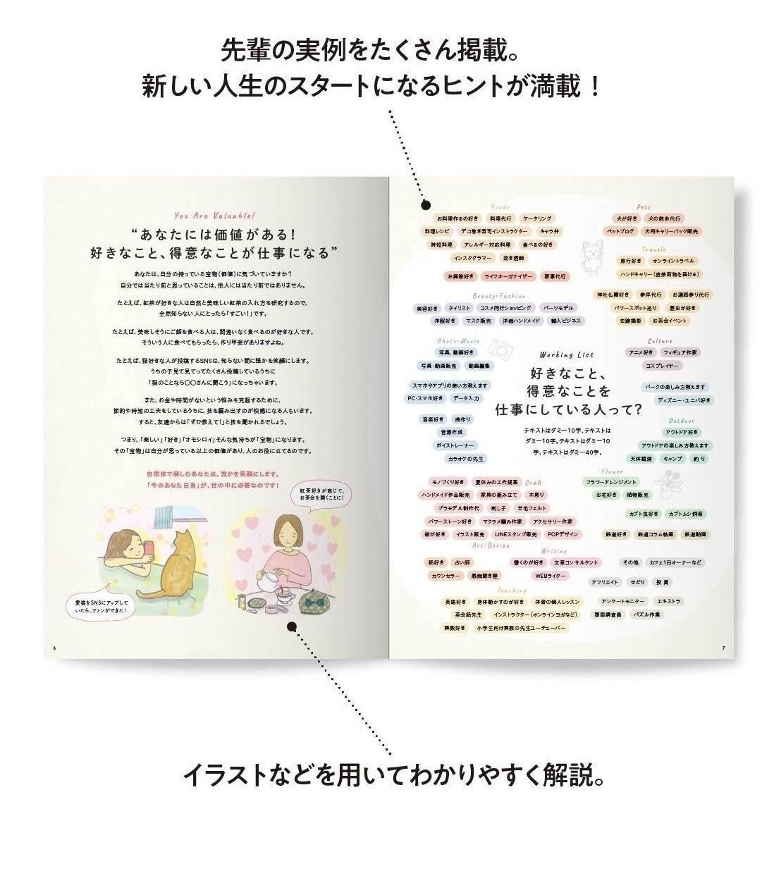 毎月届くテキストには、副業の実例など、好きなことから仕事を見つけるヒントや方法を掲載しています。テキストを読むだけでなく、描き込みワークにより、さまざまな仕事を「自分ごと」として捉えられます。