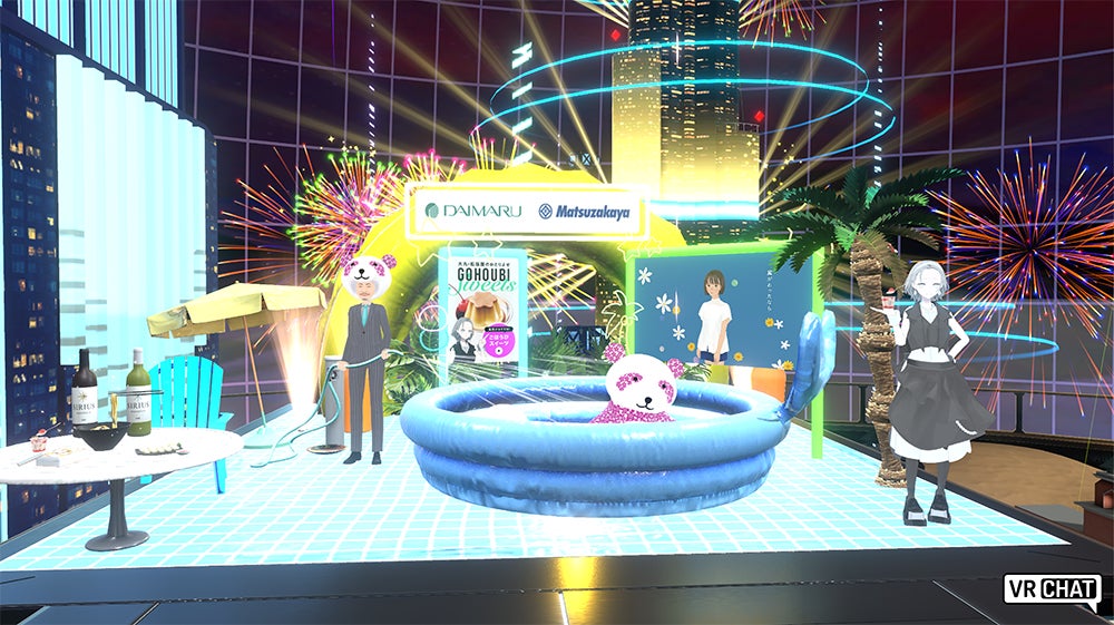 パラリアル大阪とパラリアルドバイでは、ギフト・お取り寄せチームが、涼しげなビニールプールを設置した真夏のプールサイド風ブースを展開します。ブース内ではギフト・お取り寄せにぴったりな食品3Dモデルがプールサイドのテーブルに並びます。初の夏仕様スーツに身を包んだ当社の社員アバター“ほぼほぼギフトの田中さん”の口元へ食品を持っていくと、その食品の味などの感想を教えてくれます。気になった商品は 実際に購入することも可能です(ワインを除く)。