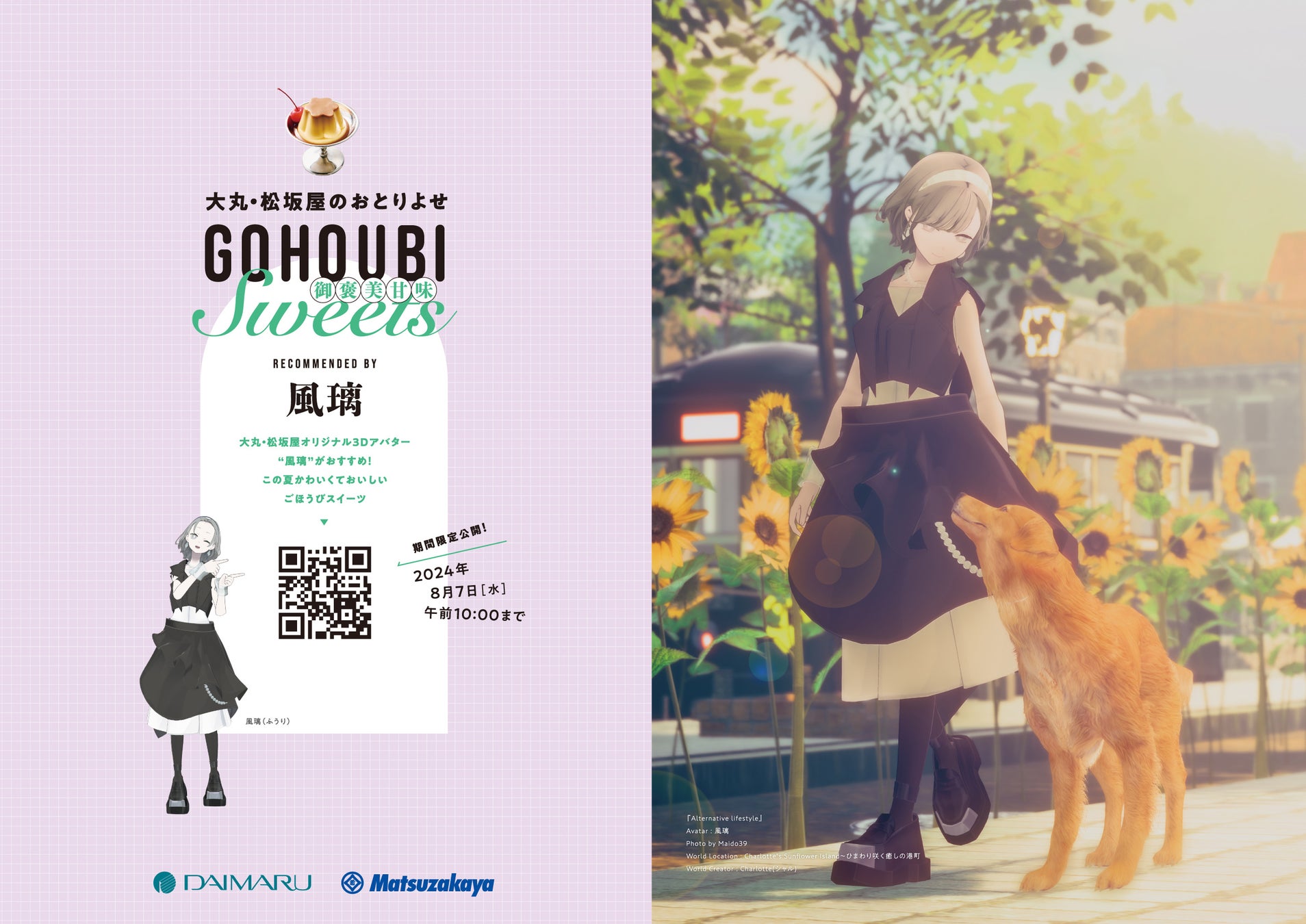 今回特別に、大丸・松坂屋アバター販売公式から、オリジナル3Dアバター“風璃“もお手伝いに来ています。また、ポスターをクリックすると、風璃がおすすめするお取り寄せスイーツやグルメなど、おすすめコンテンツをご紹介するページをご覧いただけます。