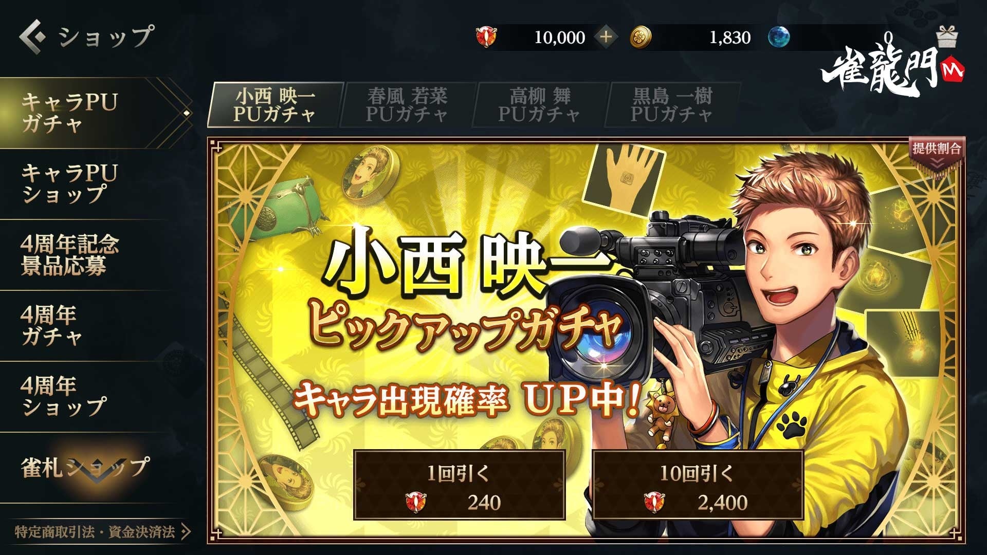 今回「小西 映一」「春風 若菜」「高柳 舞」「黒島 一樹」のピックアップガチャが登場します。