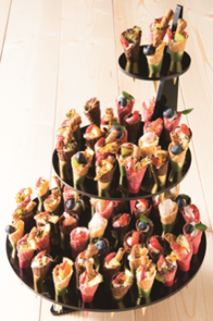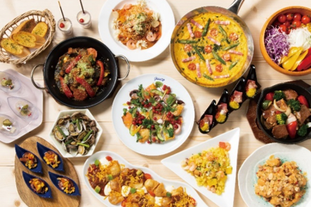 パンツァネッラ、ピンチョス、生ハム&黒胡椒春巻き、野菜の三色テリーヌ、ミニ ジャーサラダ、ラビオリ入りシチュー、白身魚のワイン蒸し ホワイトソース、海老のマヨネーズ和え アーモンド風味、マッシュポテトとミートボール、チーズとボロネーゼの衣揚げ、豚肉と野菜のワインビネガー風味、ほうれん草とベーコンの洋風卵とじ、ローストビーフ&ポルケッタ(画像(1))、カラフルプチコーンツリー(画像(3))