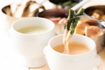 鉄板焼きのチーズソース(画像(2)左:ブロッコリー風味、右:トマト風味)