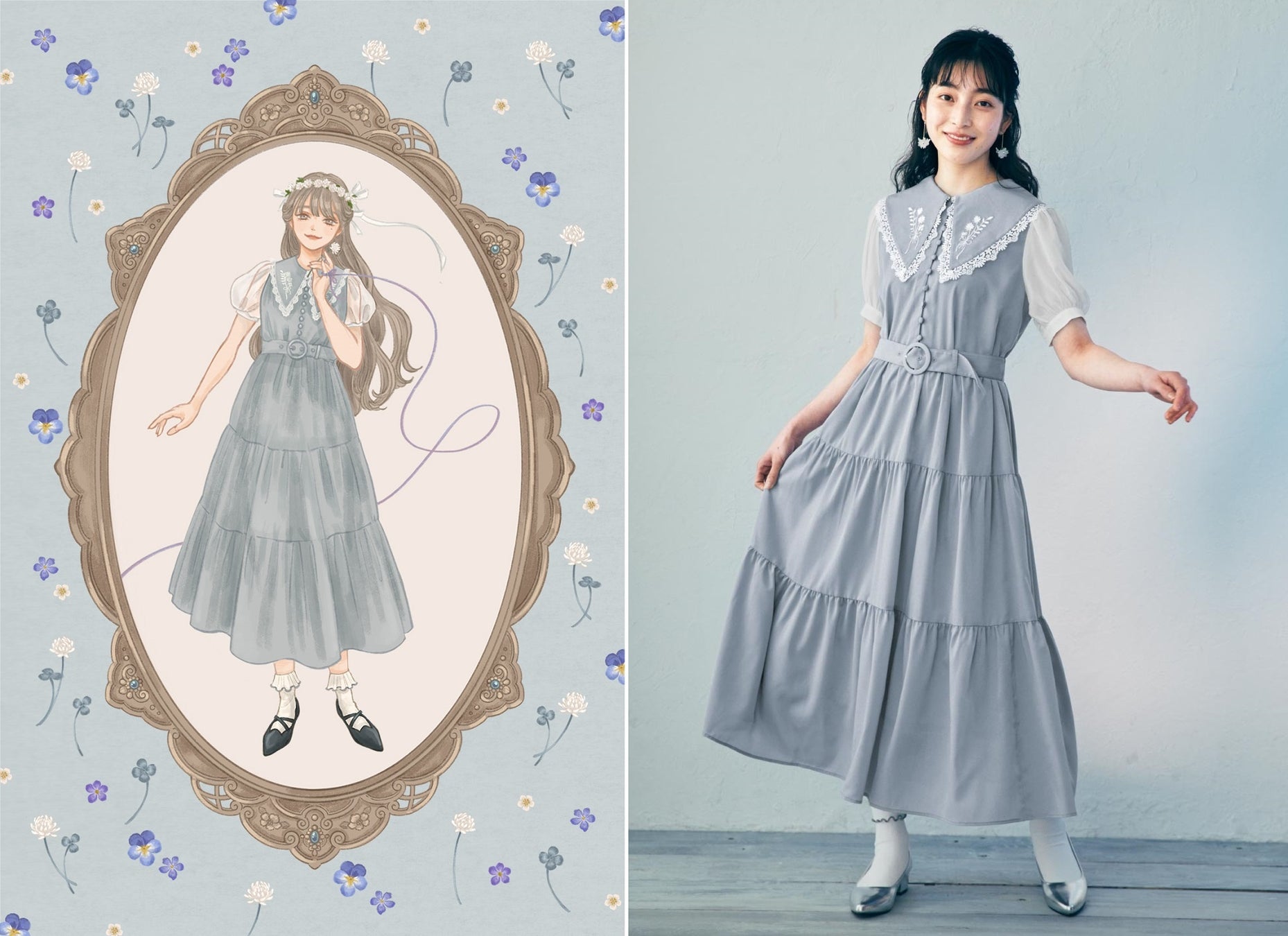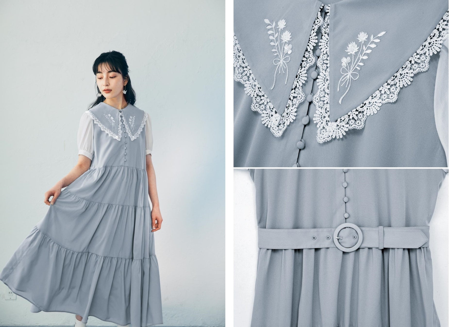 大きな衿と並んだボタン、優雅に広がるティアードスカートが印象的なワンピースです。ブルーグレーのベースに白のアクセントをほどこし、大人が着やすいデザインです。衿には「約束」の花言葉を持つシロツメクサとリボンが刺しゅうされています。今作のテーマ「自分との約束」を象徴する図案は、イラストレーターfouatonsが描き下ろした原画をもとにしています。優雅に広がるティアードスカートは、腰をベルトで締めればフィットアンドフレアのレディーなシルエットで着ることができ、ベルトを外せばリラックスムードでふんわりと着られる2-way仕様です。その日の気分に合わせて、印象を変えられます。