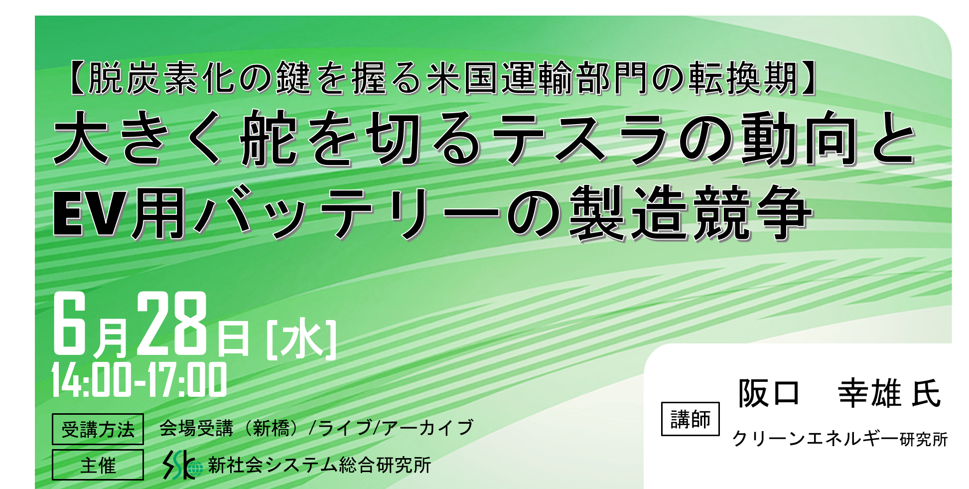 「テスラの動向とEV用バッテリーの製造競争」と題して、クリーンエネルギー研究所 代表 阪口 幸雄氏によるセミナーを2023年6月28日(水)に開催!!