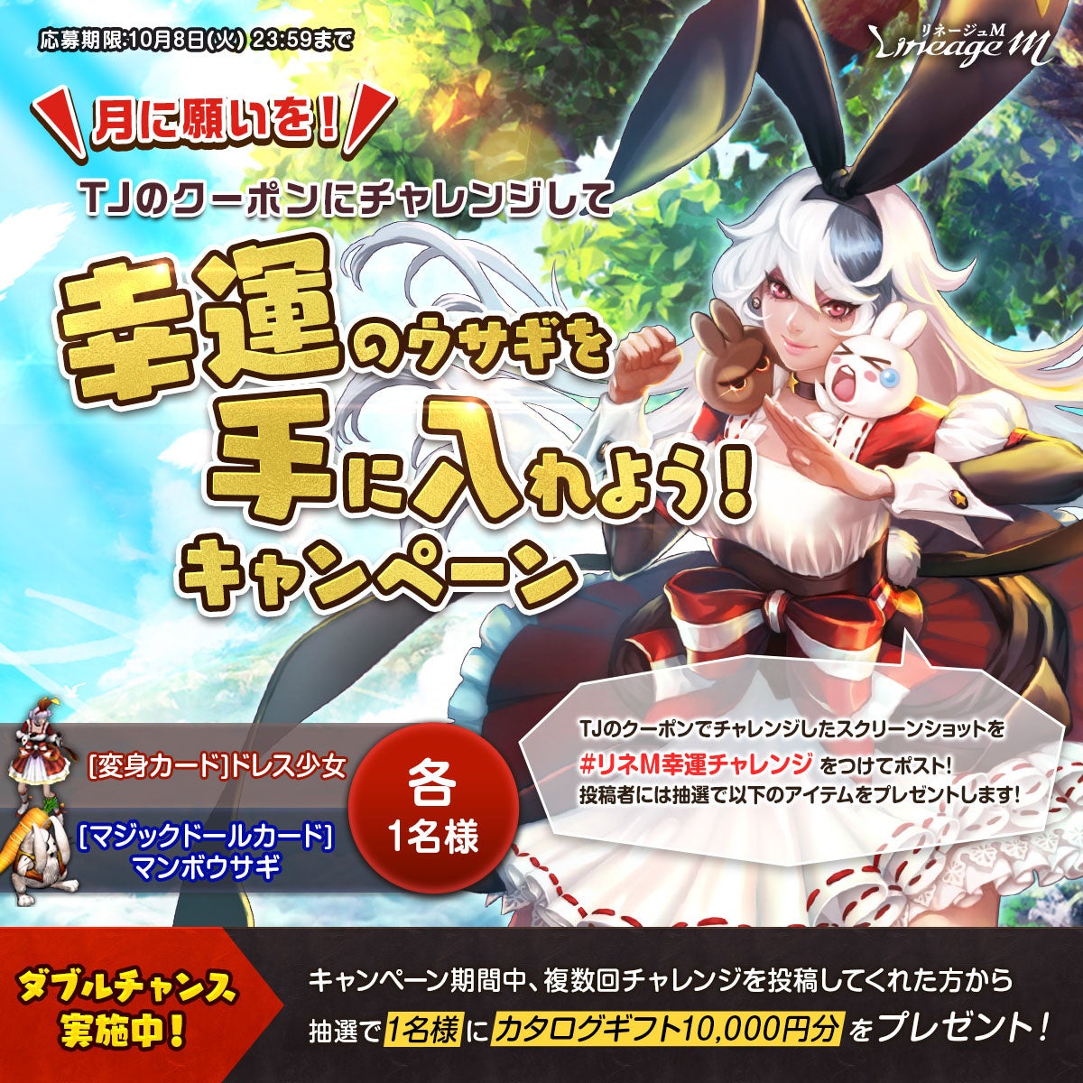リネージュM公式X( https://x.com/LineageM_JP )をフォローして、「TJのクーポン」に挑戦しているスクリーンショットを、指定ハッシュタグ #リネM幸運チャレンジ をつけてXにポストしてくれた方の中から抽選で賞品をプレゼントします。