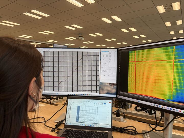 画像解析作業はドローンで撮影した可視光画像と赤外線画像の両方(注3)を用いますが、本システムでは、可視光画像の解析を行い、ひび割れの疑いがある箇所をAIによる画像解析で自動的に検出します。その後、専門スタッフによる目視確認も組み合わせることで信頼性を確保しています。さらに専門スタッフは、赤外線画像を基に温度差などの情報から内部浮きや含水などの内部劣化の可能性を解析します。これらの結果を基に、劣化箇所を整理して記載したプロット図を作成し、最終的な解析内容を体系的にまとめた報告書を提供します。なお、報告書の作成では、必要に応じて建築士による監修(注4)を組み合わせることも可能です。本サービスの開発時に沖縄県那覇市にある大型商業施設「パレットくもじ」の外壁調査で行った検証では、本システムを使用しない場合と比較し、可視光画像の解析にかかる作業時間を約48%削減できると算出されました(注5)。今後は自社で撮影した画像の解析だけでなく、ドローンによる外壁調査を実施する企業に対して、本システムを活用した画像解析作業から報告書の作成までを行うサービスの提供も予定しています。
