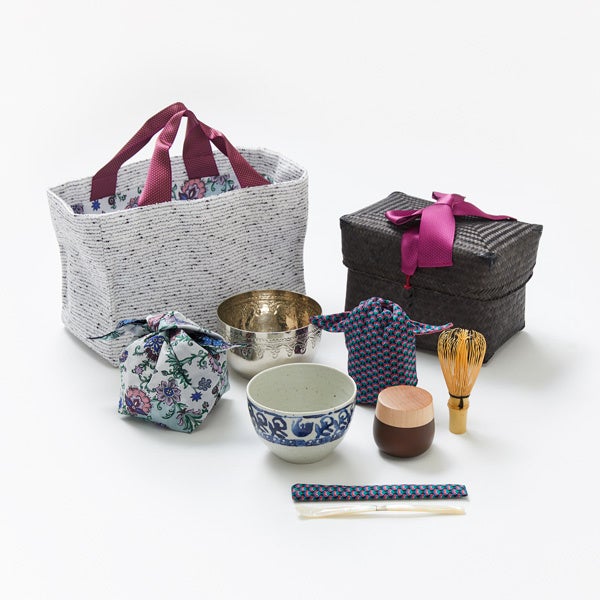 消耗品となってしまうことが多いテキスタイル。しかし、茶道具の世界では、布は何世代も大切に引き継がれることが多いアイテムです。旅先でも気軽にお茶が楽しめる「旅持ち茶籠」は、トートバッグや道具包みに仕立てました。