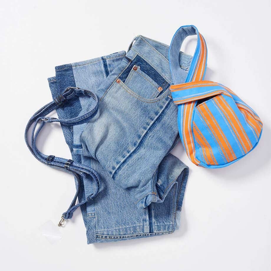 <One-o-Five>はヤマサワプレスのプライベートブランド。リーバイス®のデニム生地をアップサイクルする、「ピースdeミライ」の原点ともいえるアイテムです。デニムの表情を生かしながら一点一点組み合わせリメイクされたパンツ。デニムパンツの内股シーム部分をつなぎ合わせたスマートフォンショルダーとバックが登場します。