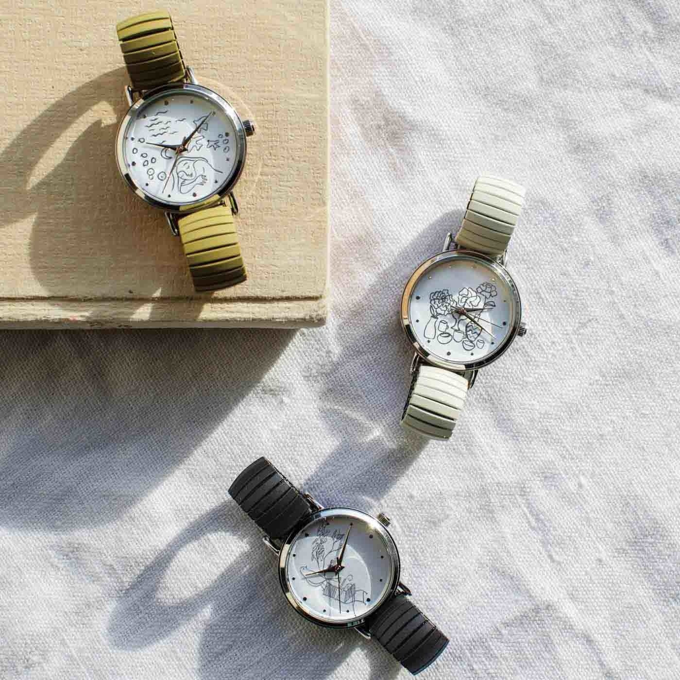 簡単に着脱できるじゃばらタイプのベルトの、10気圧防水の腕時計です。マットな質感のベルトに、アートな文字盤は、上品な洋服にも合わせやすいデザインです。