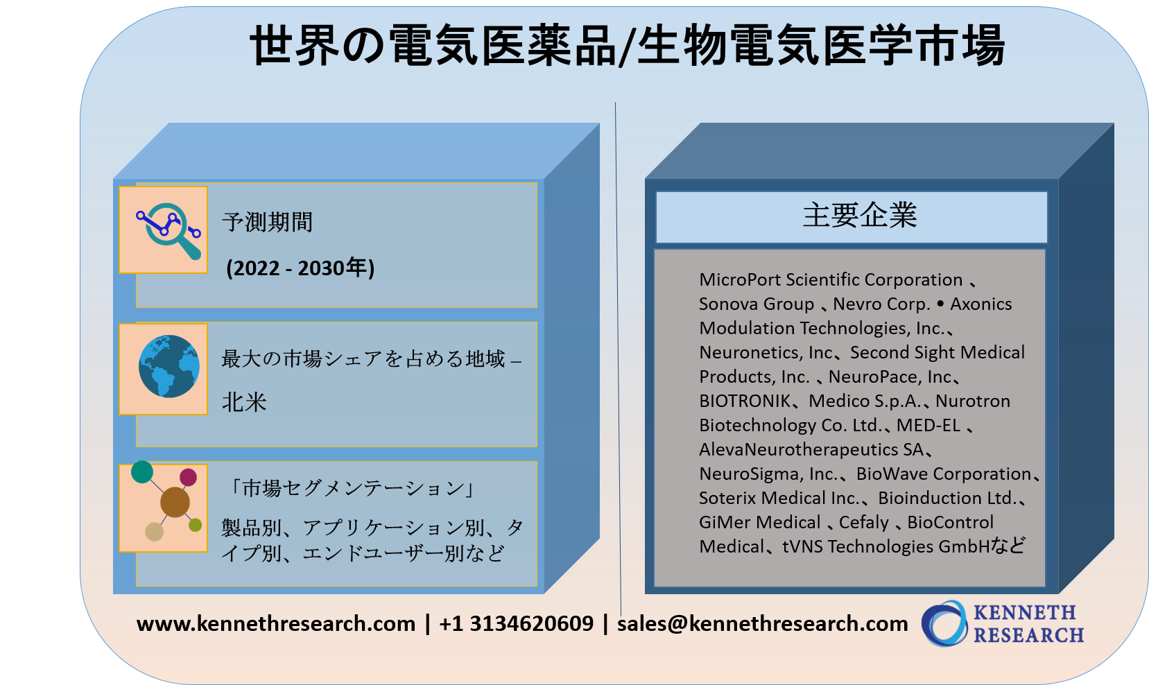 Kenneth Researchは、世界の電気医薬品/生物電気医学市場の予測評価を提供する調査レポートを2021年12月 06日 に発刊しました。これは、世界の電気医薬品/生物電気医学市場の成長ドライバー、市場機会、課題、脅威など、いくつかの主要な市場ダイナミクス強調しています。