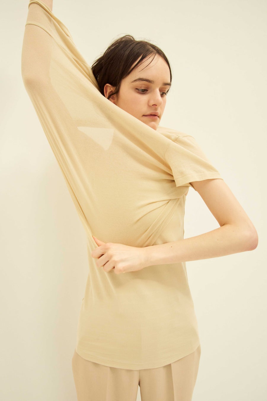 スラブ生地のシアーな薄手のTシャツに、和紙素材のカップインキャミソールを備えたセットアイテム。