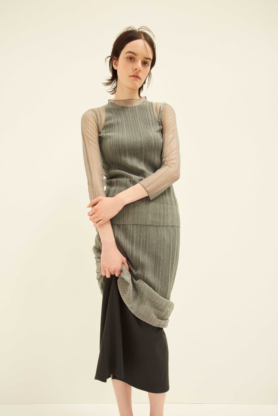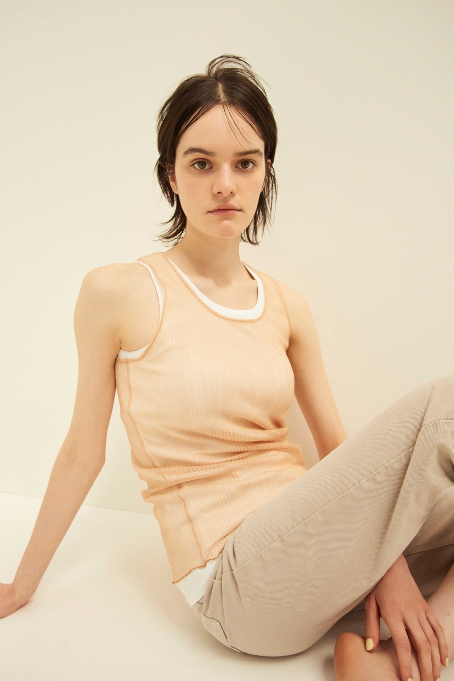 和紙素材のアメスリカップインタンクトップと、ランダムリブのシアーニットをレイヤードしたトップス。