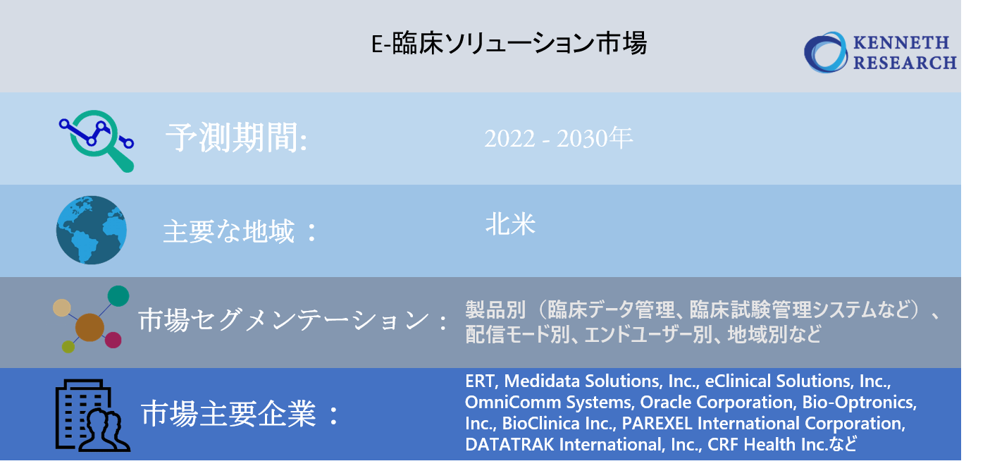 Kenneth Researchは、E-臨床ソリューション市場の予測評価を提供する調査レポートを2021年12月 06日 に発刊しました。これは、E-臨床ソリューション市場の成長ドライバー、市場機会、課題、脅威など、いくつかの主要な市場ダイナミクス強調しています。