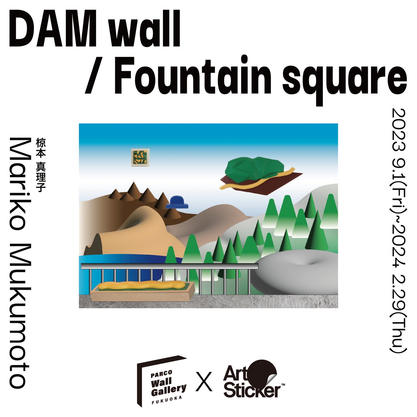 今回『PARCO Wall Gallery FUKUOKA』という多くの人が行き交う店内に、ダムや噴水の広場をつくってみたい、というイメージからこの展示ができました。ダムから見た風景をもとに制作したグラフィックと彫刻を組み合わせ、隣には噴水とダムモチーフにした青い作品を集めました。展示全体が水の広場のように、店内の空気が変わる場になれば面白いと思っています。