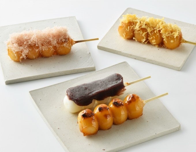〈榮太樓總本鋪〉奥左: 繁盛団子 かつを武士盛り 270円 (1本) / 奥右:【銀座三越限定】繁盛団子 天冨良 292円 (1本) 手前上:繁盛団子 濃しあん 249円 (1本) / 手前下:繁盛団子 味たら志 249円 (1本)