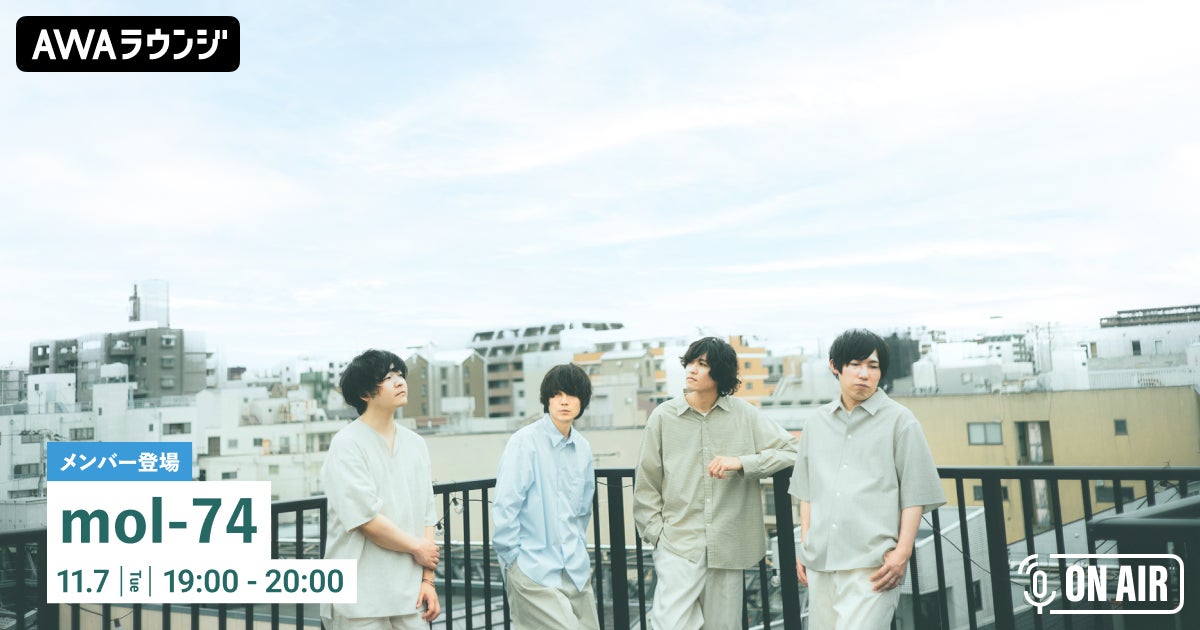 今回のイベントは、自主レーベル名「11.7」にちなみ11月7日当日を記念して開催されるもので、mol-74の楽曲はもちろん、メンバーがセレクトする他アーティストの様々な楽曲をオンエアいたします。ラウンジは、どなたでも参加することができ、AWAアプリを事前にダウンロードしていれば、リクエストやアーティストとの交流など、よりお楽しみいただけます。ぜひ、mol-74のメンバー登場ラウンジをお楽しみください。