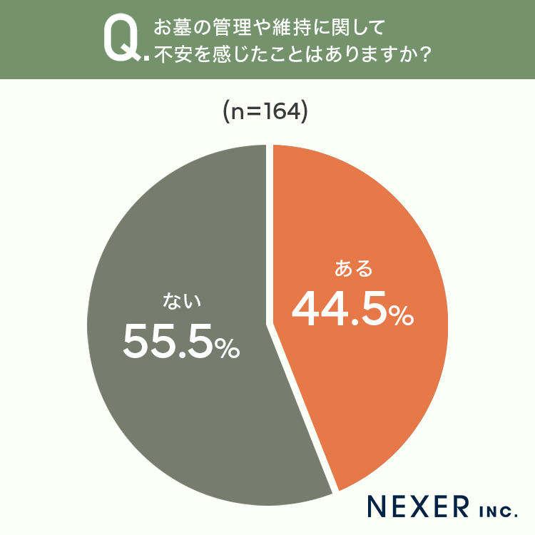 その結果「ある」が44.5%、「ない」が55.5%となり、半数近くの方がお墓の管理や維持について何かしらの不安を感じた経験があることがわかりました。