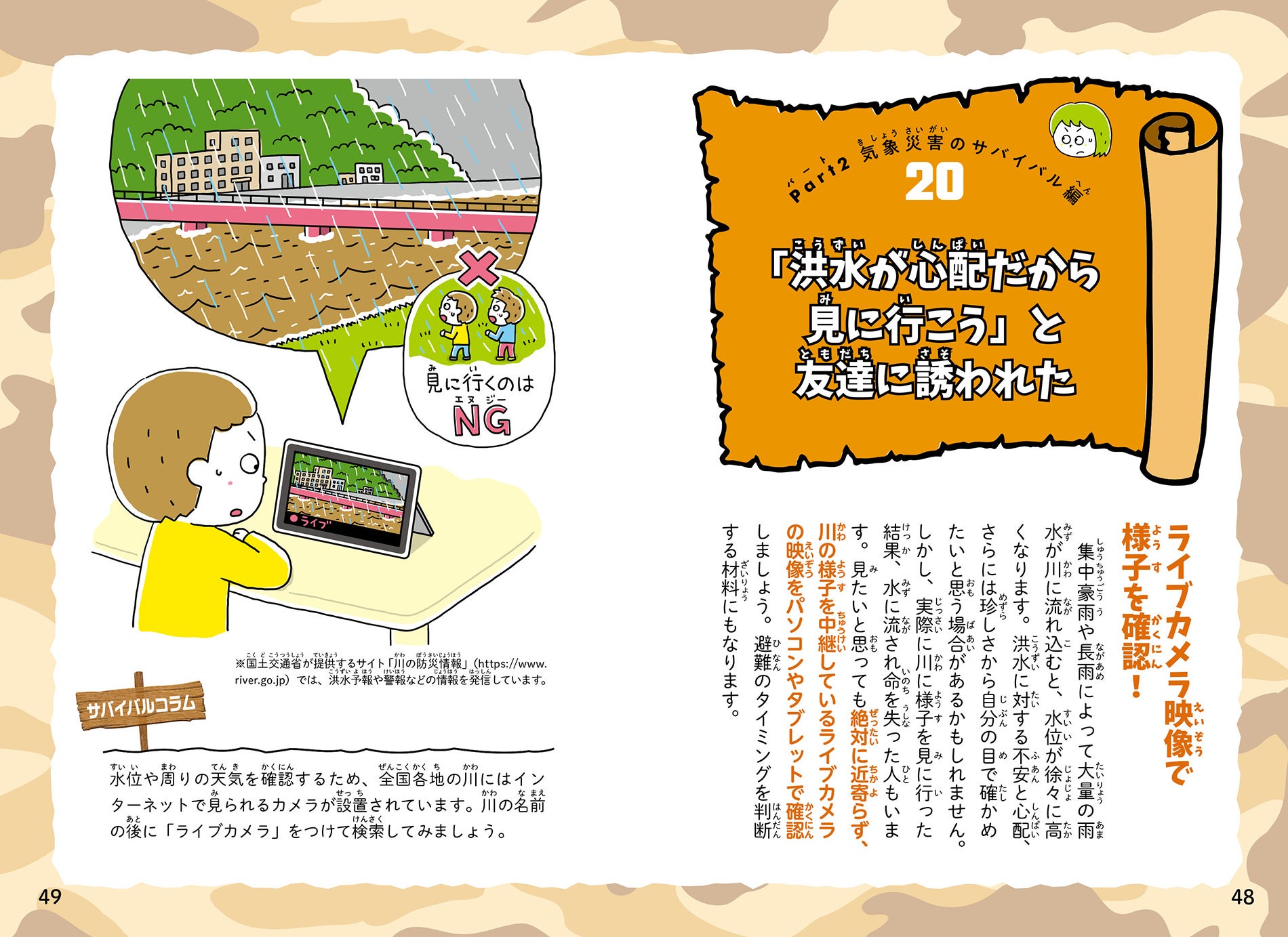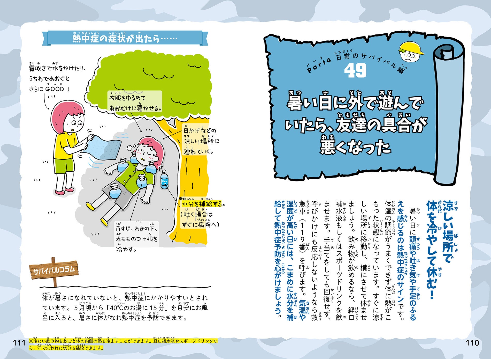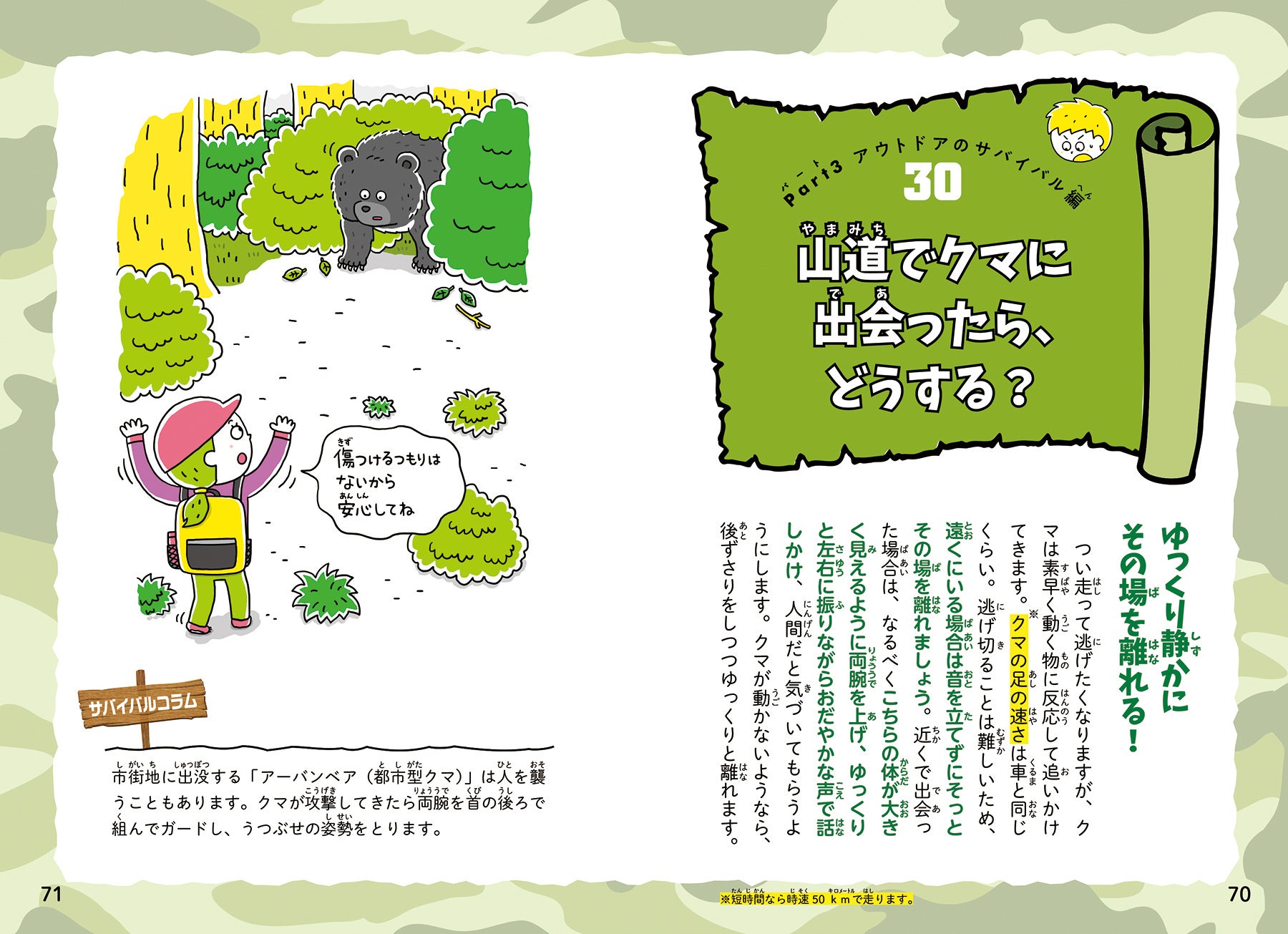 天災だけではなく、海で溺れたり、熱中症になったり、クマと遭遇、はたまた下校時に不審者に遭遇したり……などの対処法を幅広く紹介して、子どもが助かるための技術をオールカラーの図解入りで指南します。