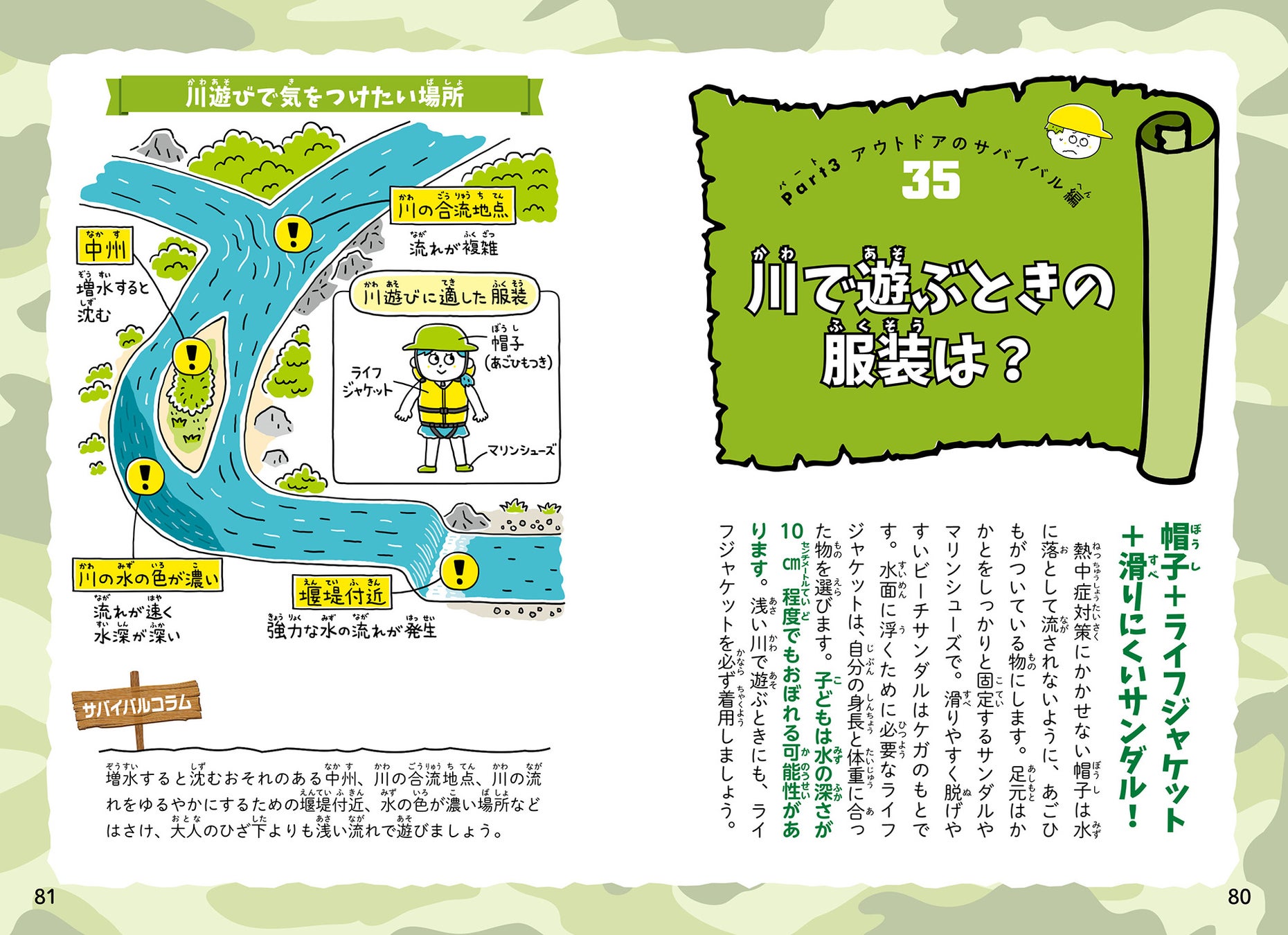 本書は天災だけではなく、海で溺れたり、熱中症になったり、はたまた下校時に不審者に遭遇したり……などの対処法を幅広く紹介して、子どもが助かるための技術をオールカラーの図解入りで指南する、ジュニア向けサバイバル本です。親子で読めば、なお安心!