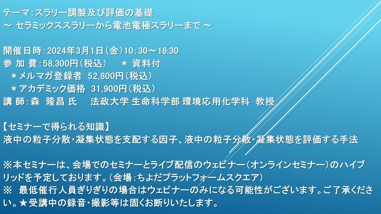【会場/ライブ配信ハイブリッドセミナー】スラリー調製及び評価の基礎 〜 セラミックススラリーから電池電極スラリーまで 〜 3月1日(金)開催 主催:(株)シーエムシー・リサーチ